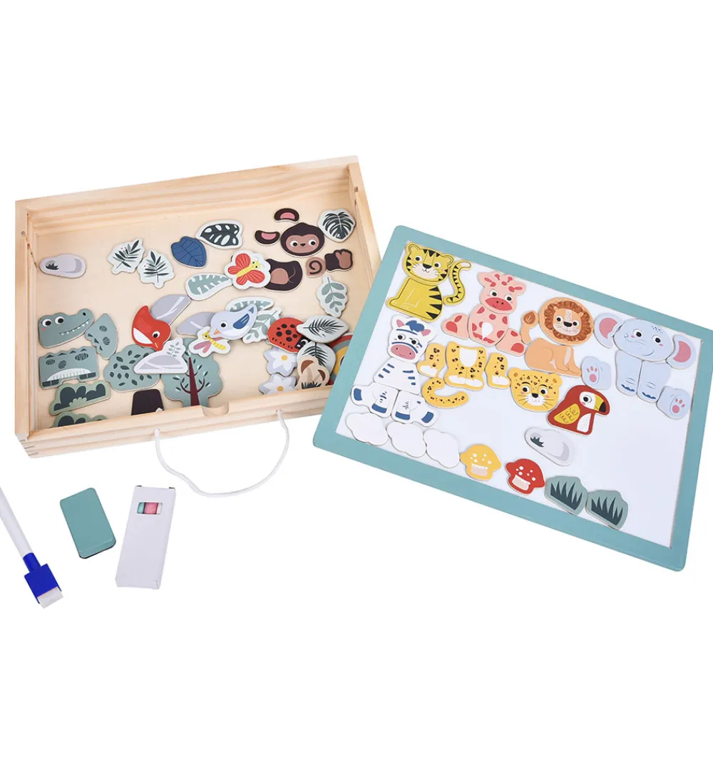 Kinder and Kids aktivitetslegetøjet består af en kasse med et magnetisk, tosidet låg, hvor den ene er en kridttavle og den anden er et whiteboard, hvor der kan sættes de mangle medfølgende magnetbrikker, som danner dyr og natur. Der medfølger også tavlekridt, en whiteboard pen og en tavlesvamp.