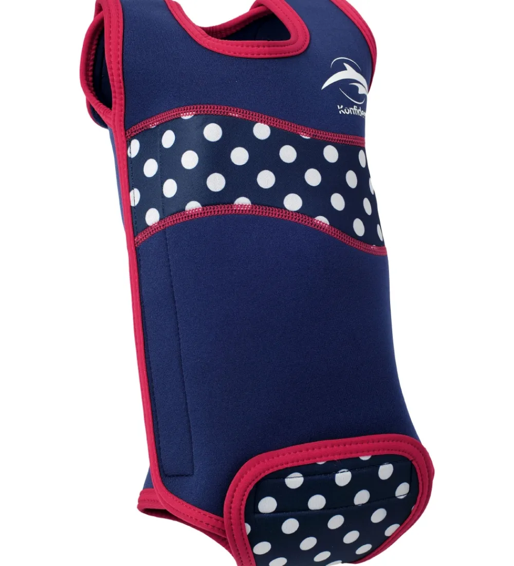 Fin Konfidence våddragt i rød og navyblå med hvide plokaprikker og med print af det velkendte Konfidence-delfinlogo fortil i venstre side. Våddragten er fremstillet i blød og behagelig neopren, som er et fleksibelt materiale, der også beskytter 100% mod solens UV-stråling, samtidig med den holder dit barn varmt både i og ude af vandet.
