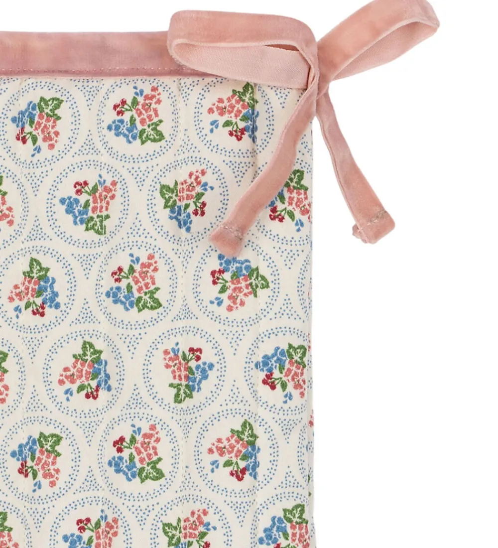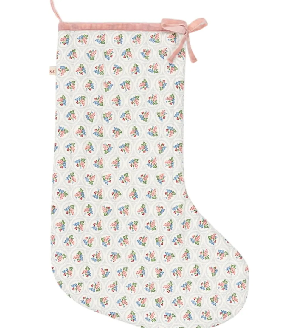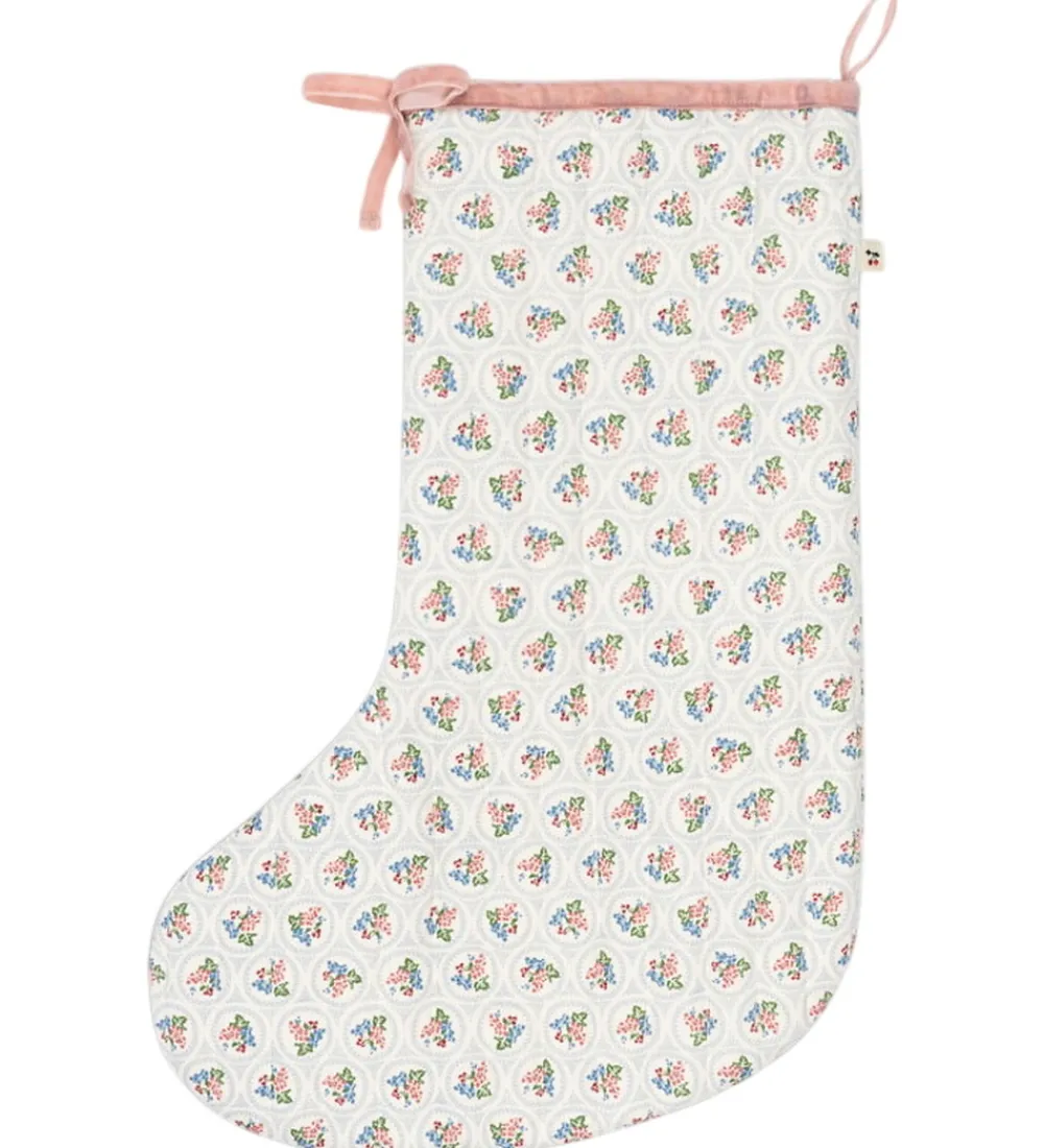 Sød Konges Sløjd julesok i hvid med et mønster af blå cirkler og blomster i rød, blå og grøn.