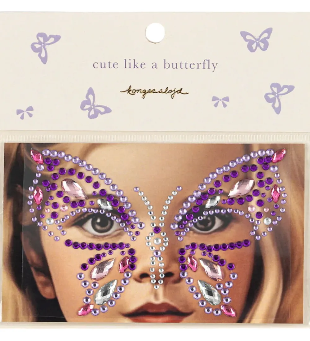 Fine Konges Sløjd ansigtssmykker med små plastikjuveler i skinnende lilla og rosa farver, som kan danne en sommerfugl.