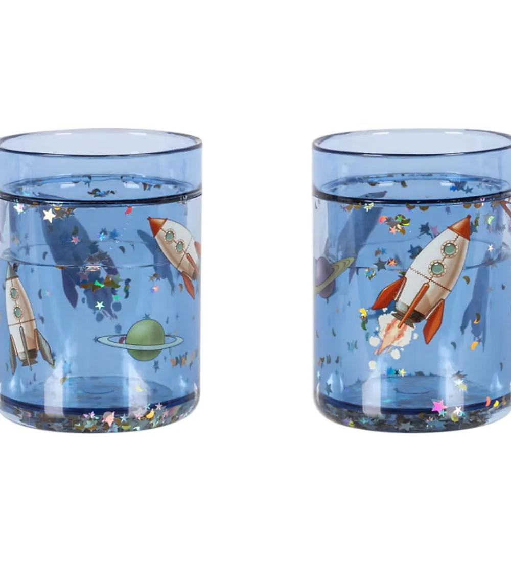 Flotte Konges Sløjd glitterkopper solgt i en 2-pak med glitrende detaljer med rumraketter og planeter.