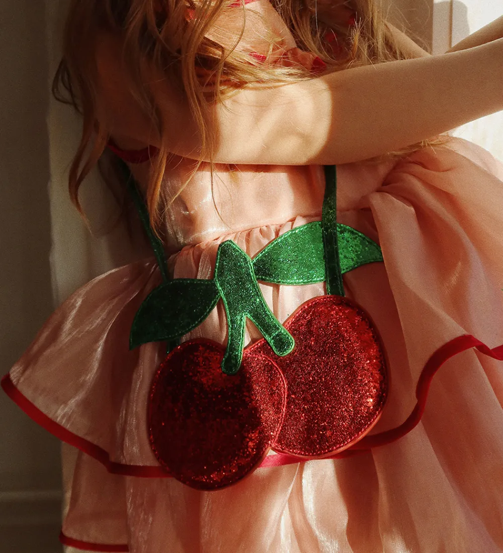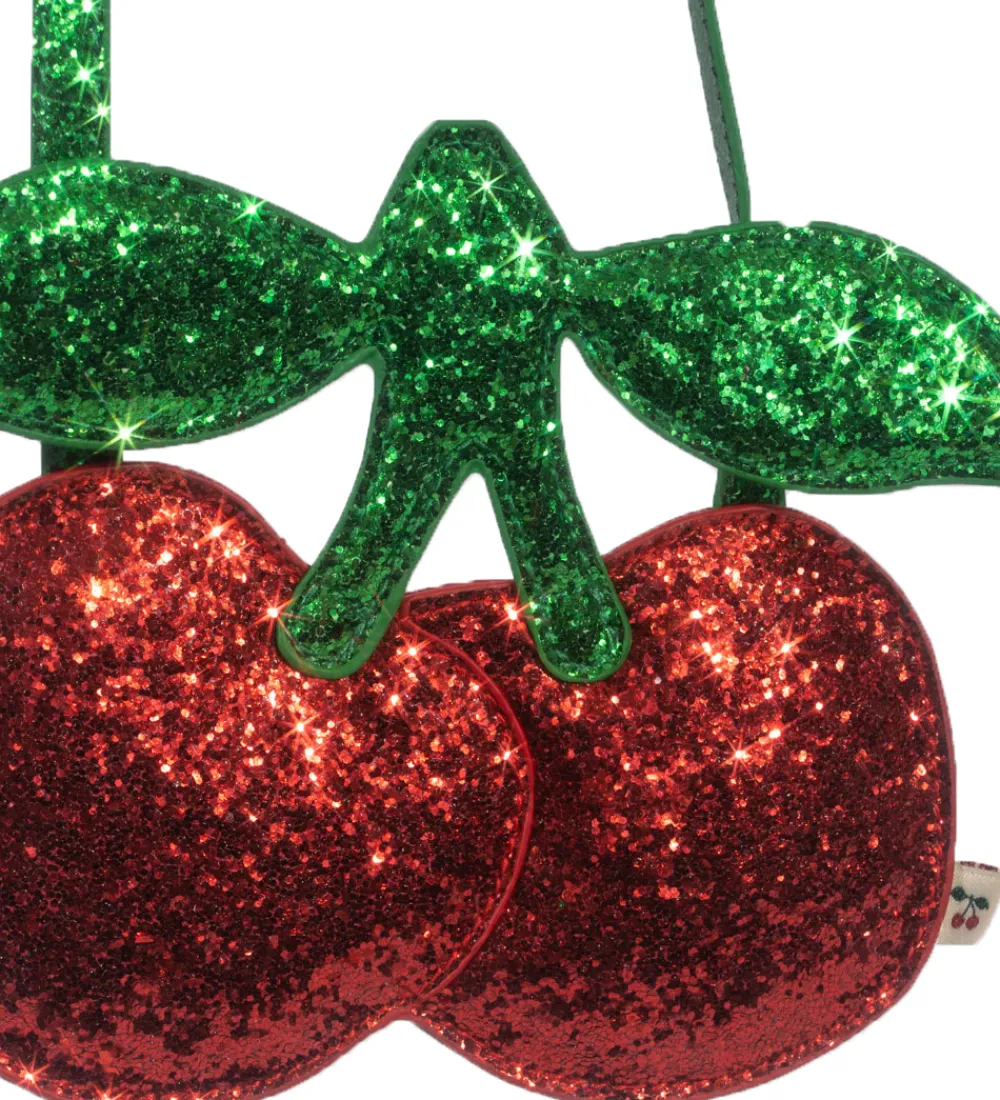 Sød Konges Sløjd skuldertaske lavet som et kirsebær i rød og grøn med glimmer.