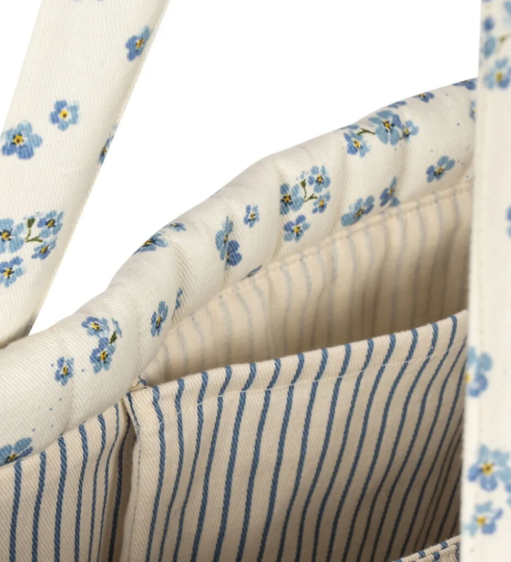 Rummelig Konges Sløjd pusletaske i råhvid med fine blå blomstermotiver og quiltet struktur. Teksten ” Ciao Bella” er printet i rød skrift på den ene side, mens der på den anden side er en lille logoapplikation.