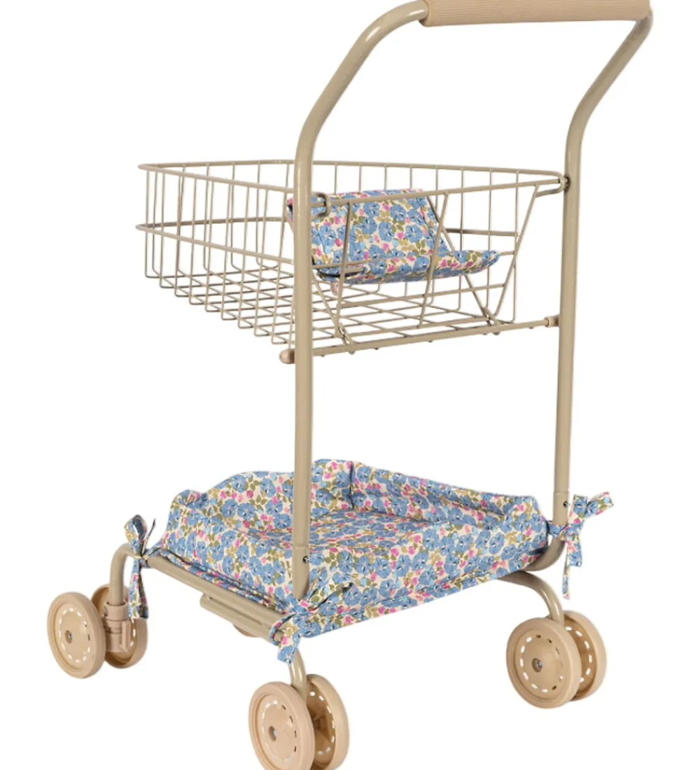 Fin Konges Sløjd indkøbsvogn i beige med et farverigt alloverprint af små blomster på sædet og puden.