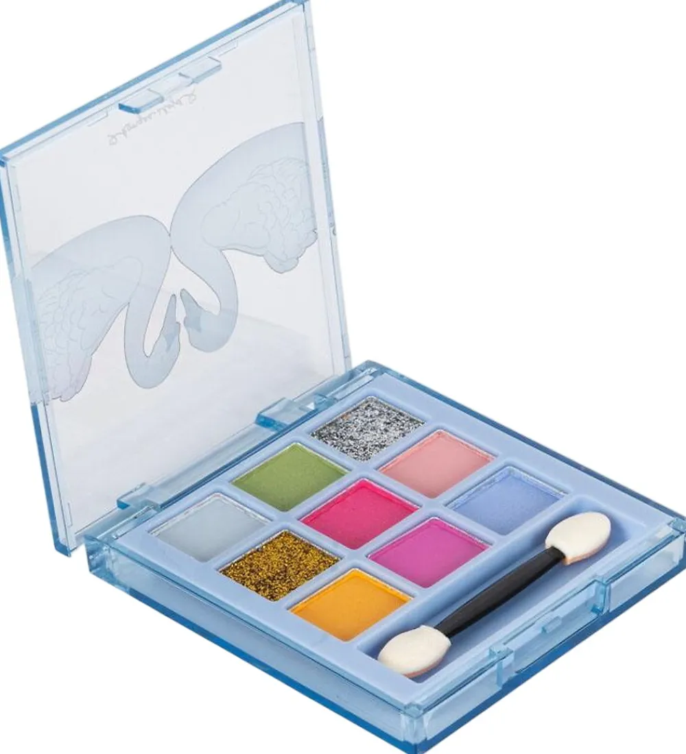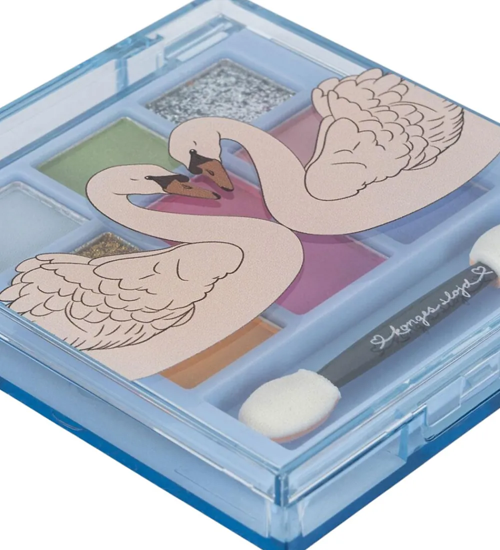 Flot Konges Sløjd øjenskygge i en lys blå æske, der har print af Konges Sløjd velkendte svaner, og indeholder ni farverige nuancer og glitrende detaljer. Den medfølgende applikator gør øjenskyggerne nemme at påføre, og de fjernes også let. Perfekt til små kreative sjæle.