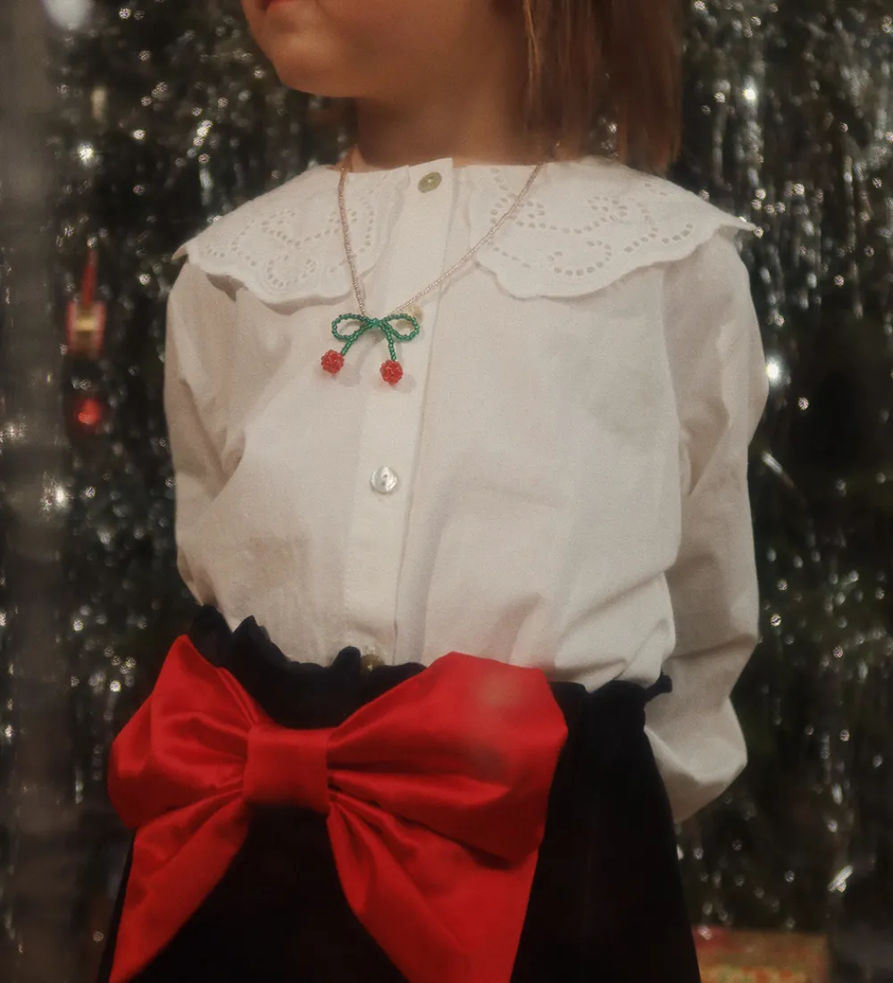 Skønne Konges Sløjd smykkesæt med et armbånd og en halskæde med hvide, ræde og grønne glasperler og en elastiksnor. Begge smykker har et smukt kirsebærdesign.