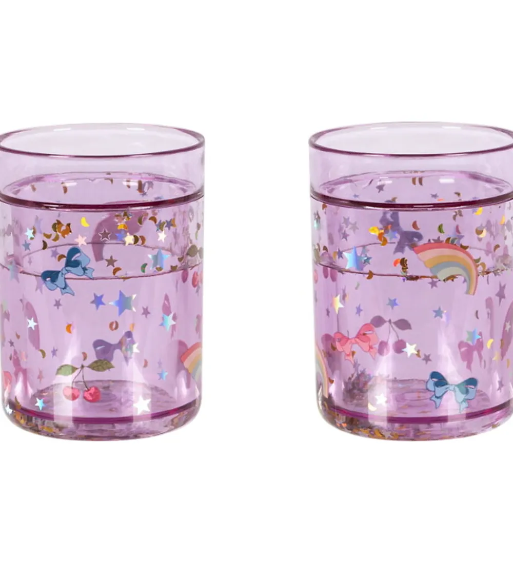 Seje Konges Sløjd glitterkopper i transparent lilla et fint print af regnbuer, stjerner og sløjfer i forskellige farver samt glitrende dealjer. Glitterkopperne sælges som en 2-pak.