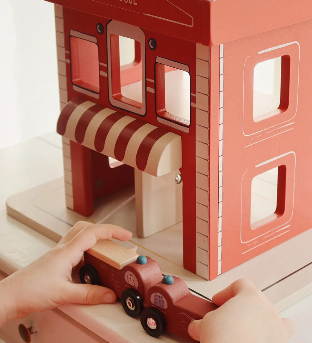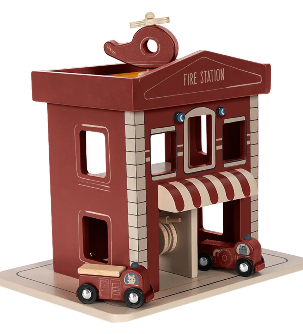 Konges Sløjd brandstationen er i flere etager med helikopterlandingsplads, brandslange, port og brandmandsstang, og der medfølger to brandbiler med hjul, der kan dreje rundt, og en brandhelikopter.