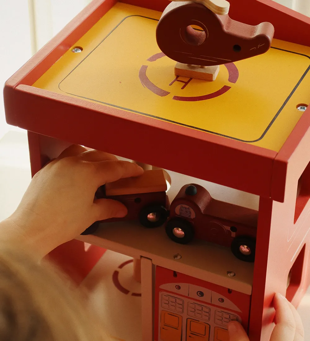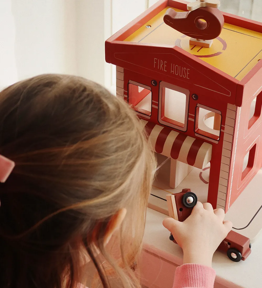 Fantastisk Konges Sløjd brandstation med biler og helikopter af træ malet i røde og hvide farver og byder på timers sjov.