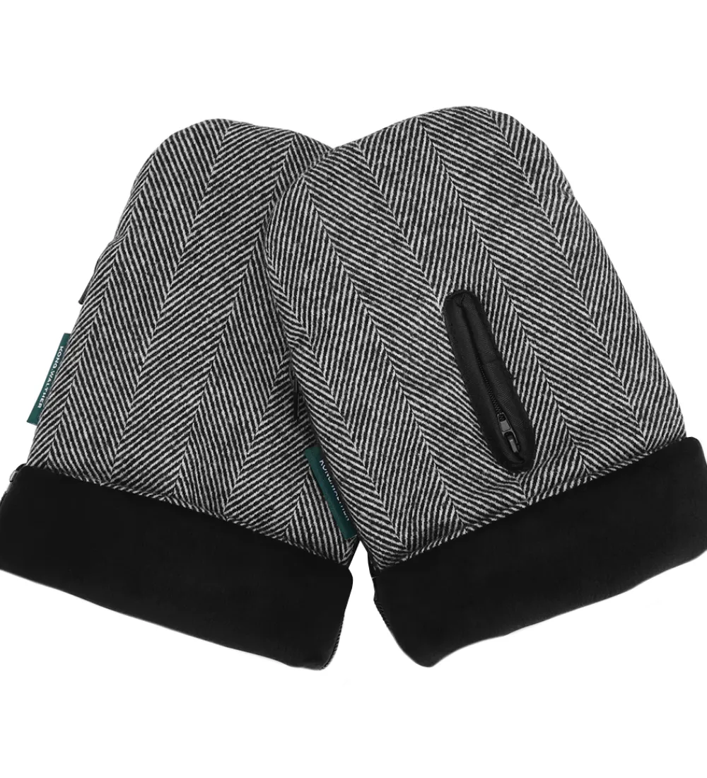 Smarte Kong Walther barnevognshandsker i tweed med sorte og beige striber samt med et sort for af velour.