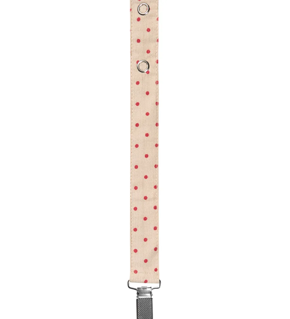 Flot Lalaby suttesnor i lysebeige med et fint, rødt prikmønster. Lalaby suttesnoren kombinerer stil og funktionalitet med trykknapper og et metalspænde som sikrer at sutten altid er inden for rækkevidde.
