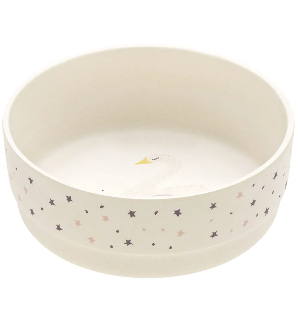 Praktisk Lässig skål i beige med et fint print af stjerner i lilla og rosa, rundt i kanten, samt en sød rosa svane i bunden.