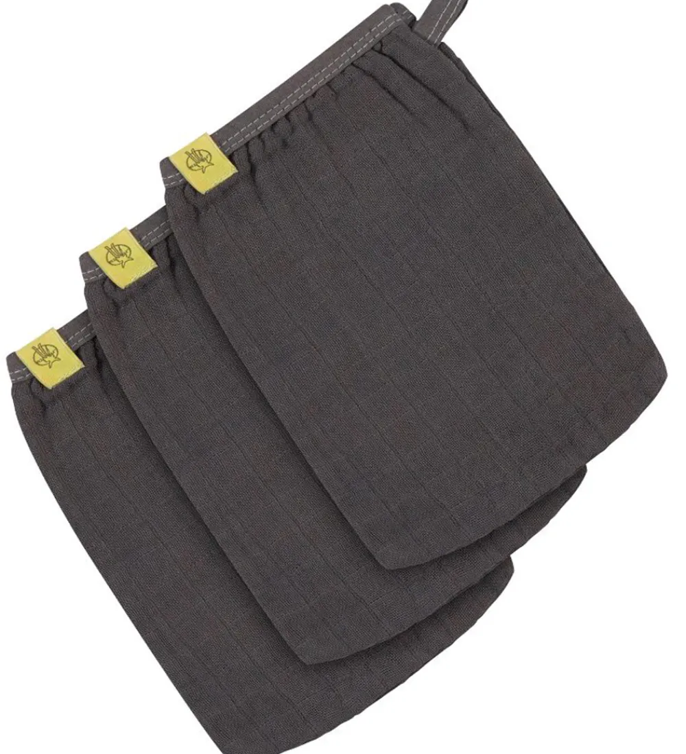 Praktiske Lässig vaskehandsker i grå musselin, solgt i en 3-pak.