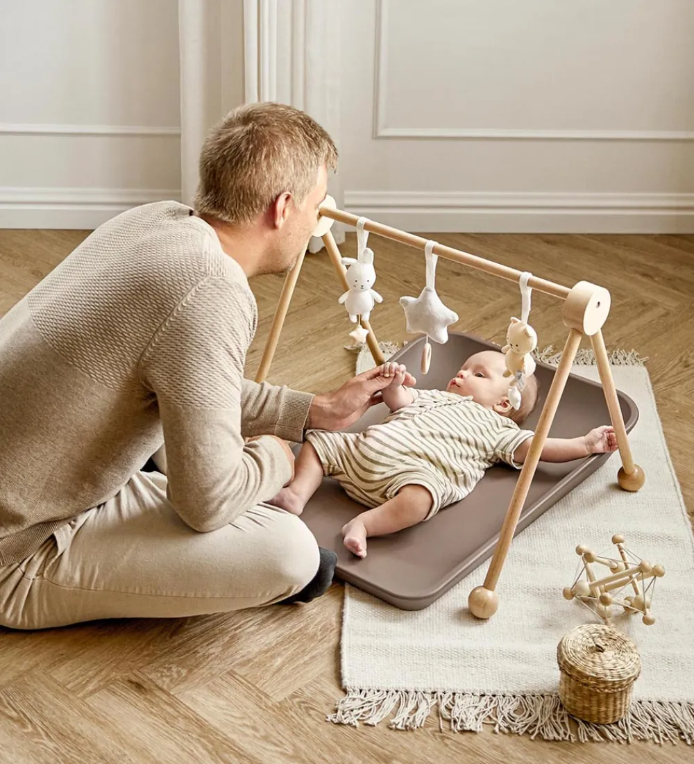 Puslepuden har høje kanter, som sørger for, at babyen ikke triller ned. Undersiden af puden er lavet af træ, som giver en god stabilitet, og der er små gummidutter under, så puslepuden bliver liggende, hvor den skal.