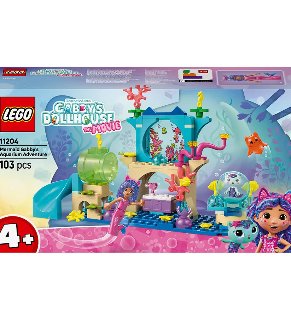 Fint LEGO® Gabby’s Dollhouse sæt med i alt 103 klodser, der bygger en undervandsscene fra “The Movie” med Mermaid Gabby’s Aquarium Adventure. Sættet indeholder figur af Gabby i havfrueform, kattevenner, akvarieelementer, rutsjebane og farverigt undervandstilbehør.