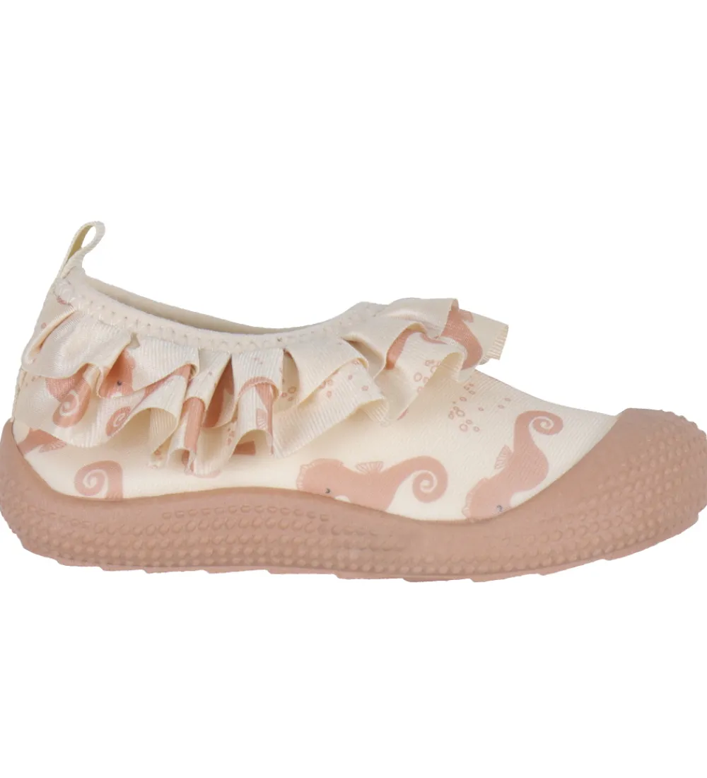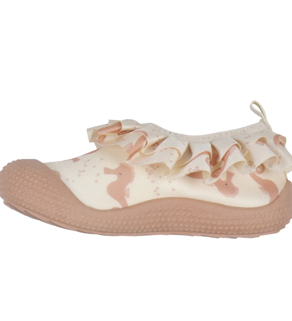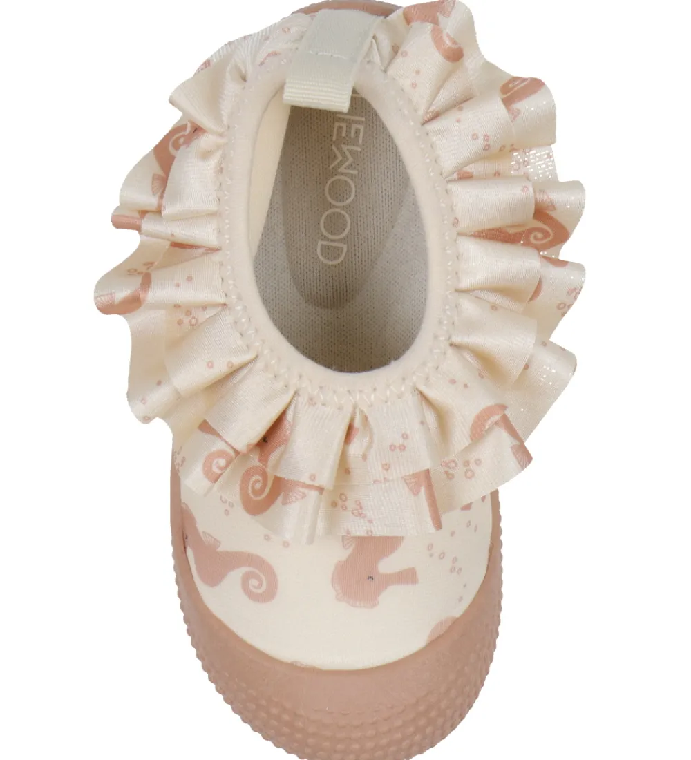 Fine Liewood badesko i beige med et alloverprint af søde søheste i rosa og med en flot flæsekant i åbningen.
