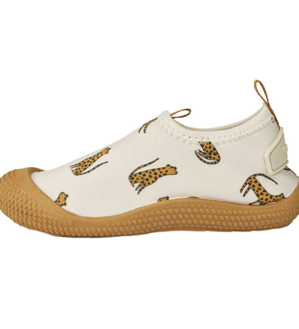 Søde Liewood badesko i beige med et alloverprint af leoparder.