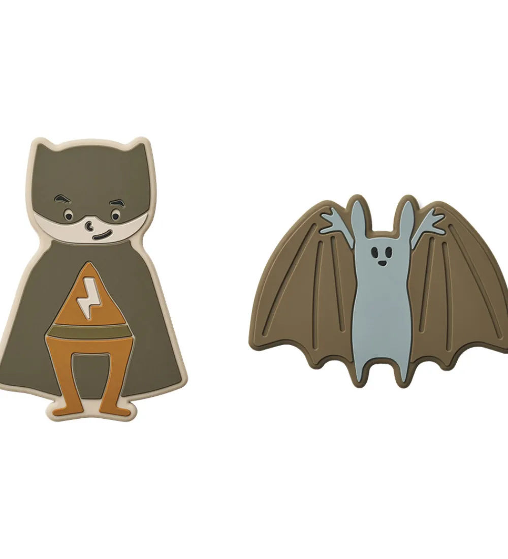 Sjovt Liewood bidelegetøj i en 2-pak med en superhelt og en flagermus i støvet brun, beige, blå og gyldenbrun.