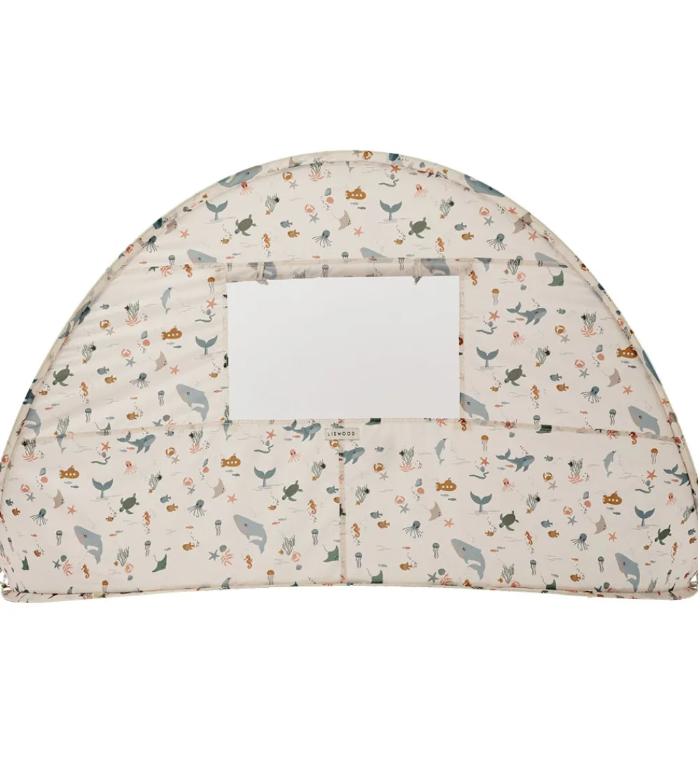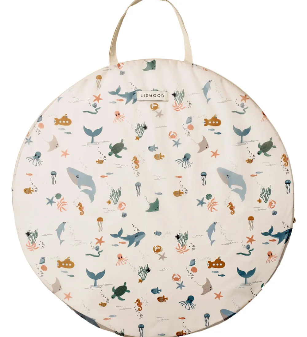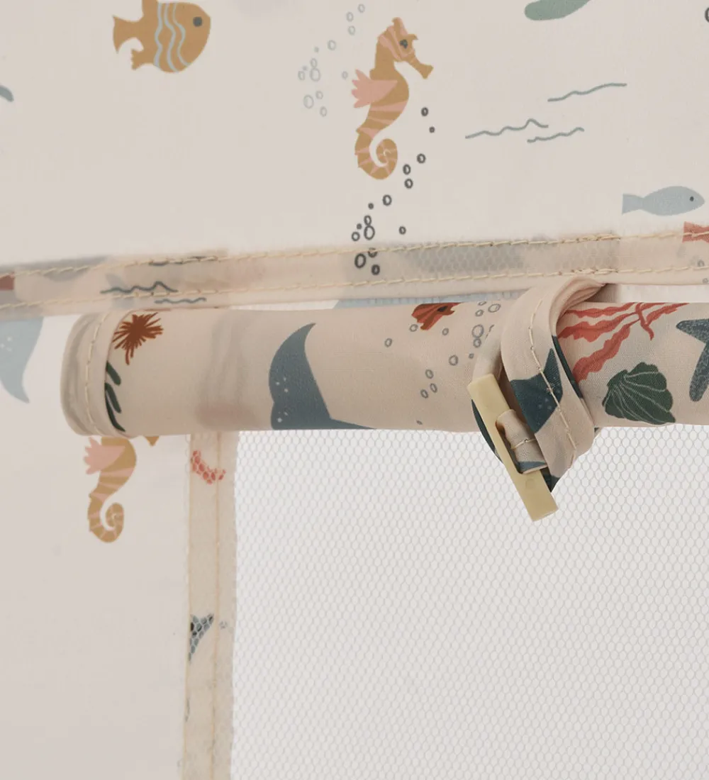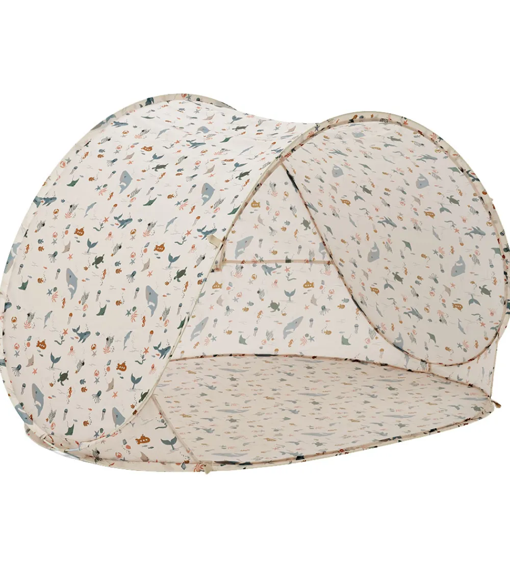 Smart Liewood pop op-strandtelt i beige med et allover print af forskellige dyr og planter fra havet.