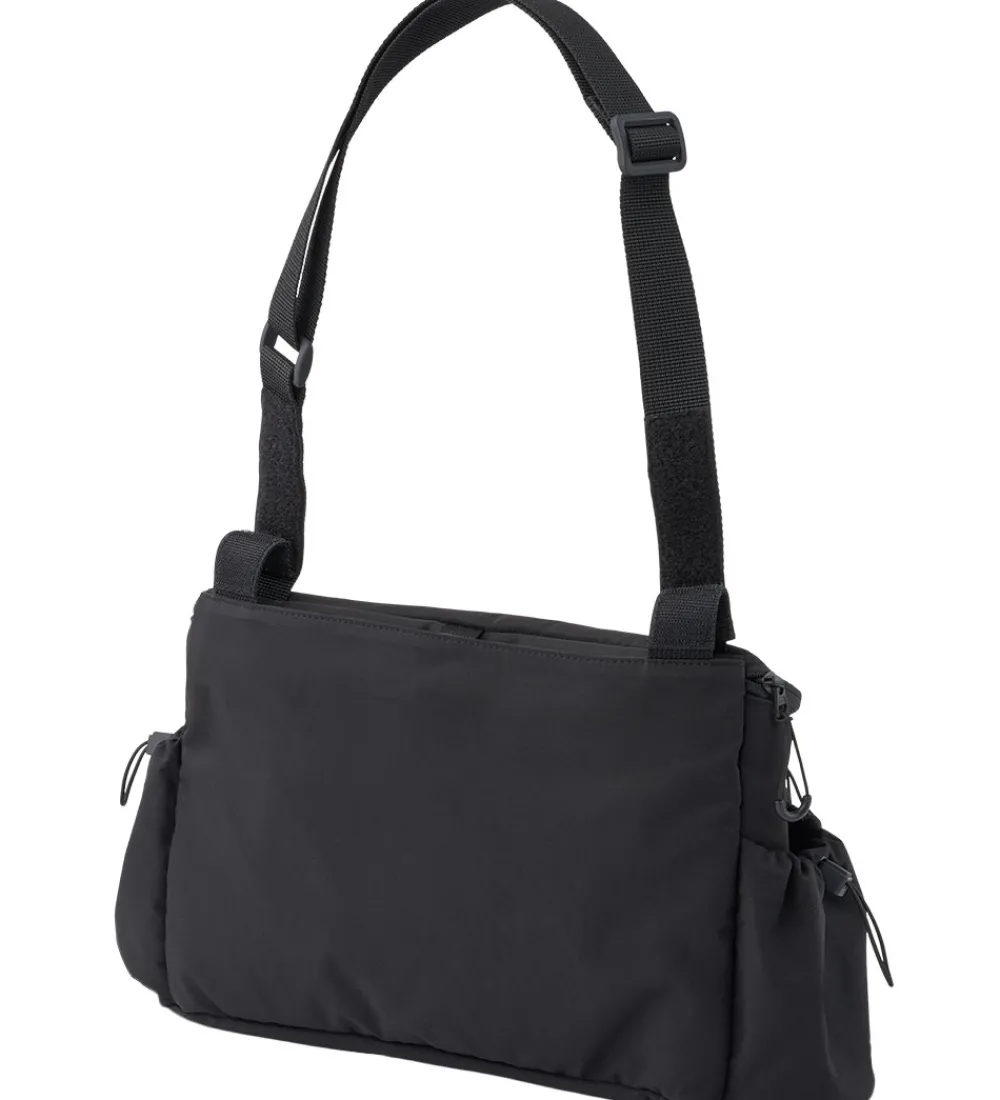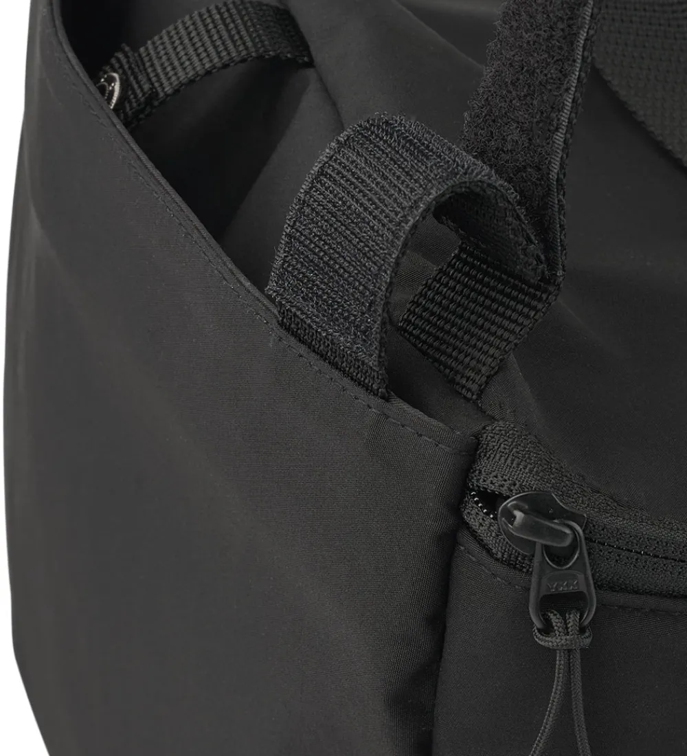 På ydersiden har pusletasken på den ene side en lynlåslomme, og på den anden side er der en stor lomme med trykknapslukning. I hver ende af pusletasken er der en stiklomme med en justerbar elastikstrop i åbningen.