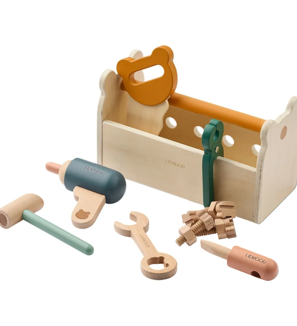 Værktøjskassen inkluderer forskellige værktøjer som en sav, skruenøgle, tænger, boremaskine, hammer, skruetrækker, skruer og møtrikkerg. Liewood sikrer kvalitet og sjov i legetøjet.