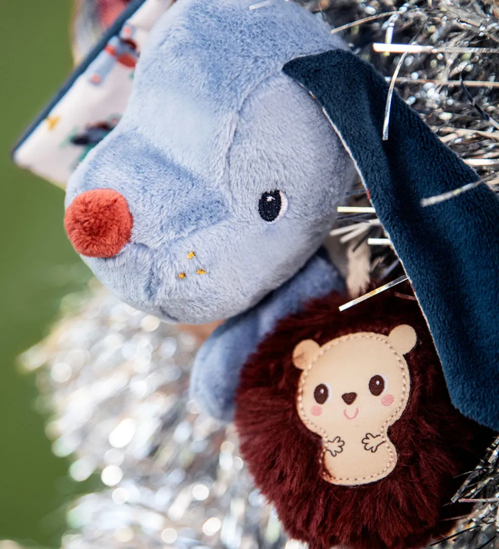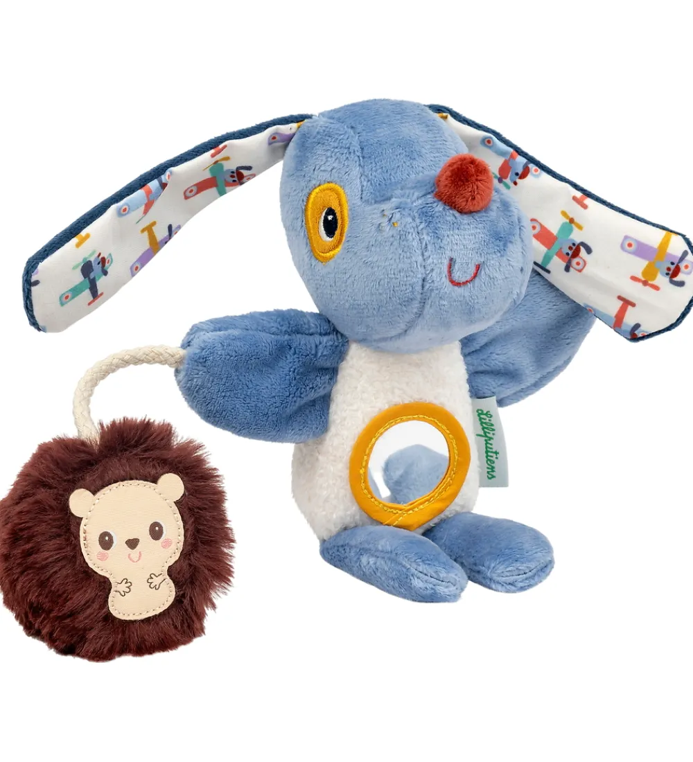 Herligt Lilliputiens aktivitetslegetøj i form af hunden Jules i blå og hvid med mønstrede ører og et spejl på maven. Når man ryster den siger den en beroligende raslelyd. Jules har en snor med et fantasidyr i hånden, som siger en knitrende lyd.