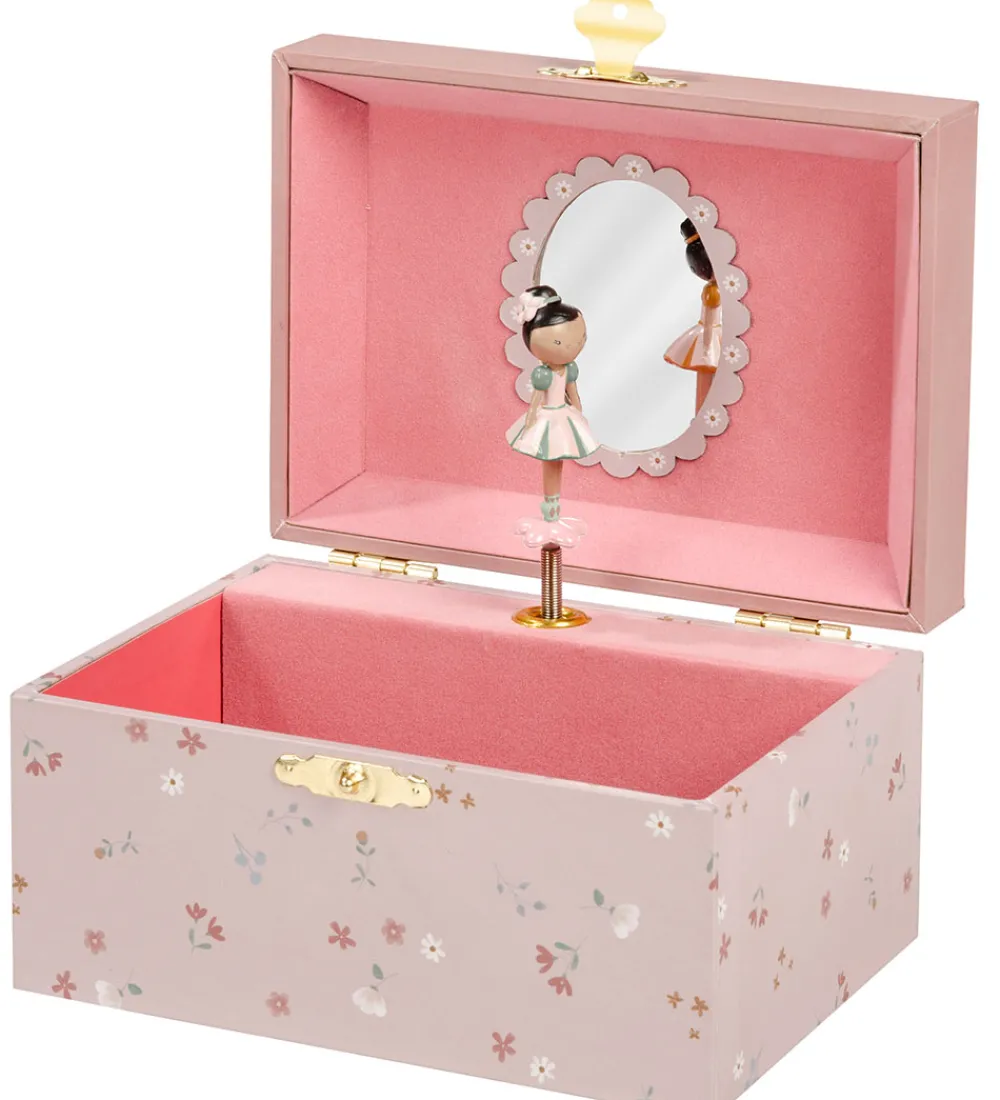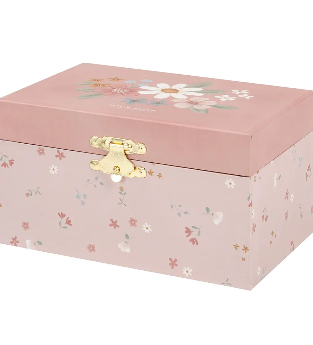 Fint Little Dutch smykkeskrin i rosa med et blomsterprint på siderne i rosa, hvid og grønne nuancer og et flot blomsterprint på låget.
