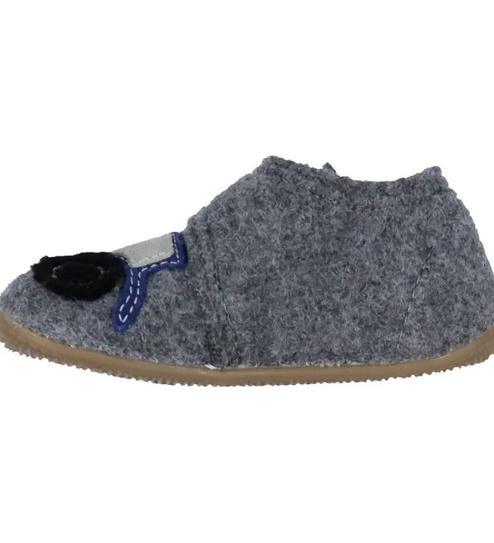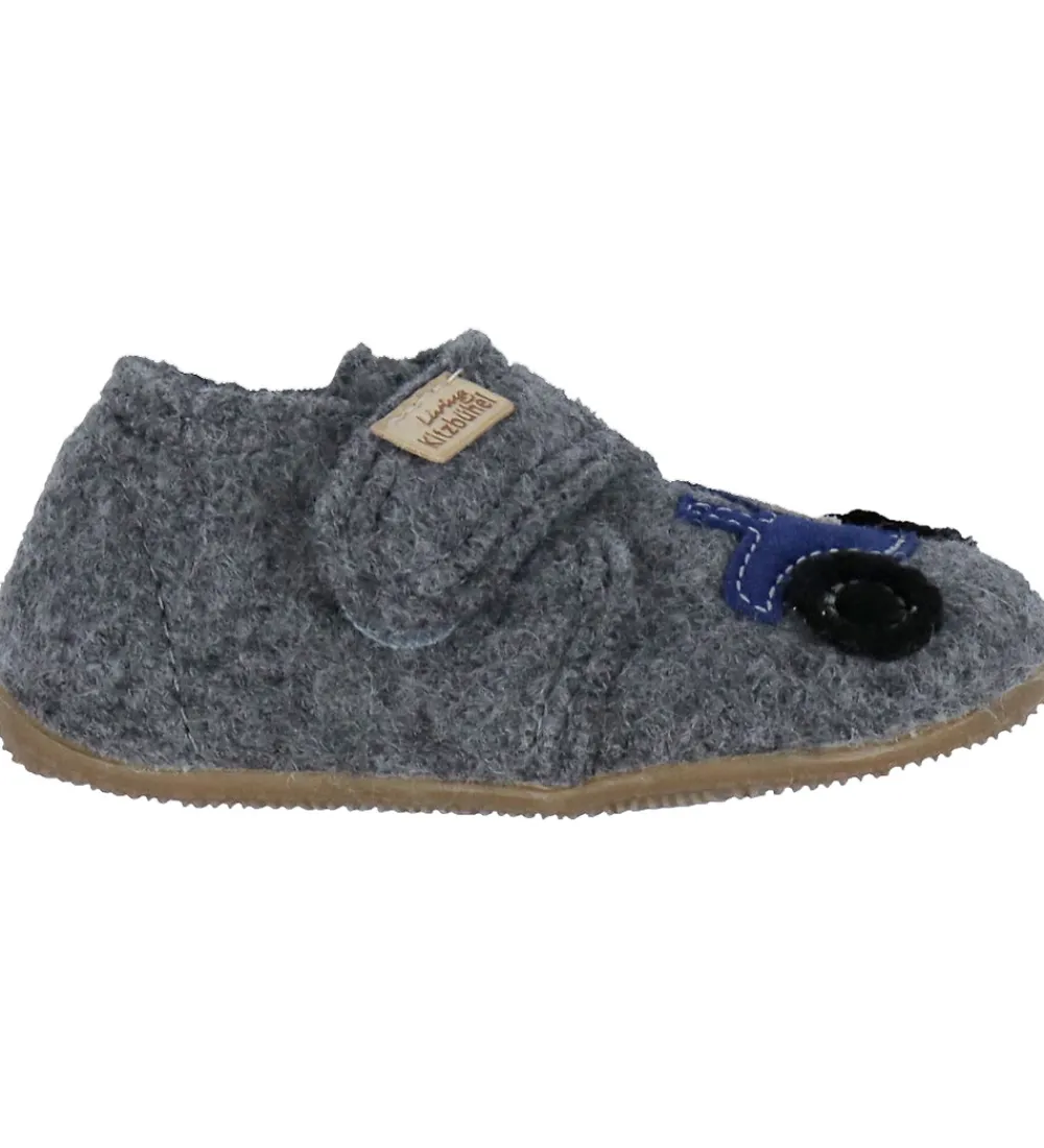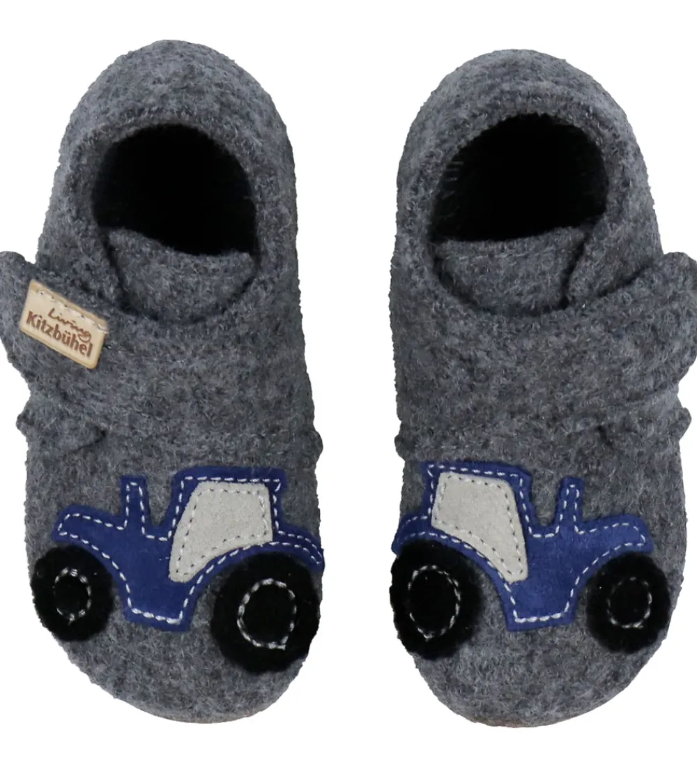 Skønne Living Kitzbühel hjemmesko i gråmeleret uld med en applikation af en blå og sort traktor på begge fødder.