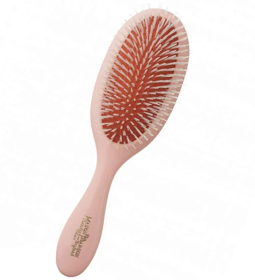 Mason Pearson børsten har bløde og skånsomme hår af nylon, der lader den glide let igennem det filtrede hår. Hårbørstens hår er designet specielt til at give silkeblødt og medgørligt hår. Børstehårene har forskellige længder, så de effektivt masserer hovedbunden og transporterer hårets naturlige olier ud i længderne, samtidig med at den giver håret en glansfuld finish.