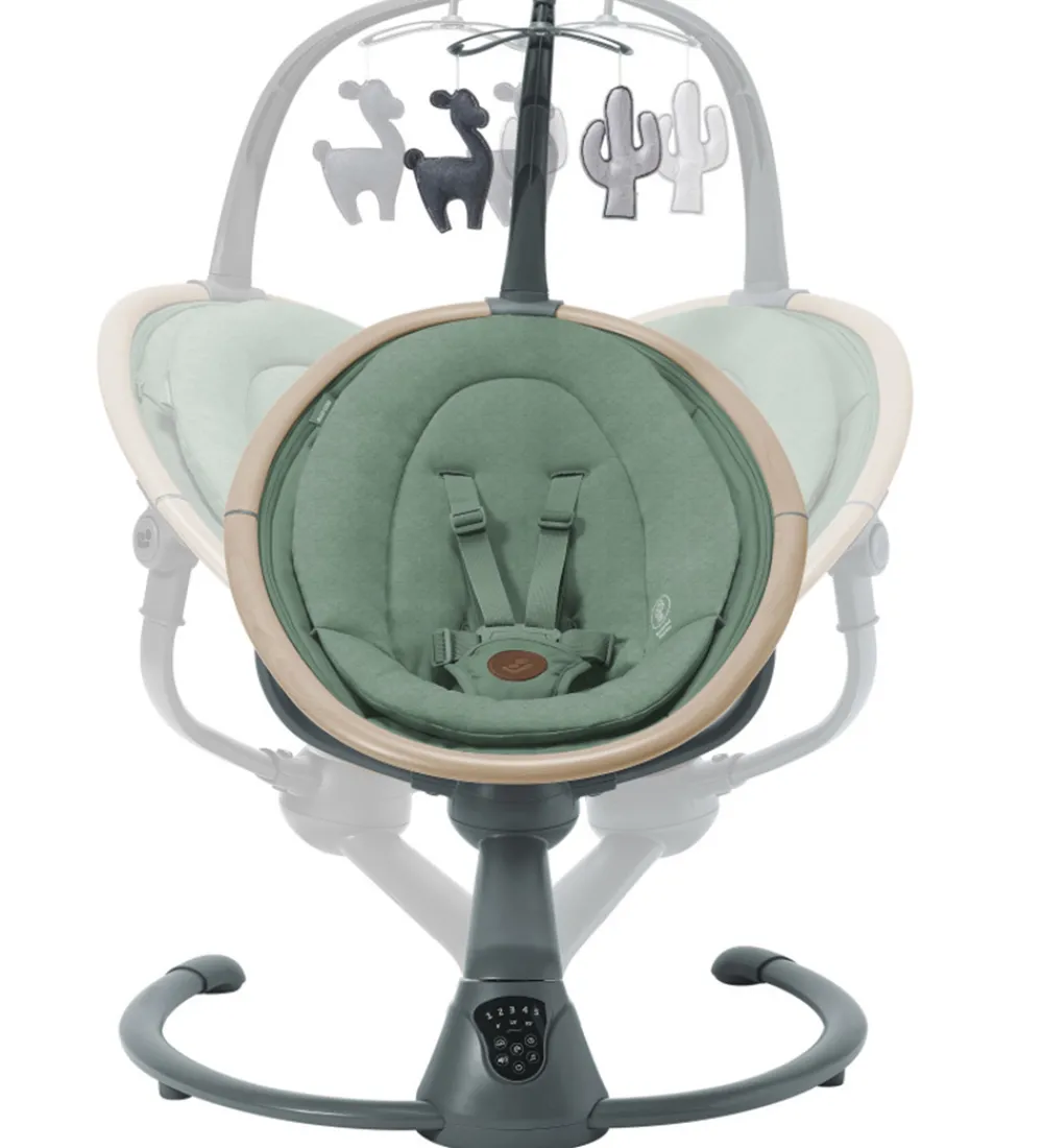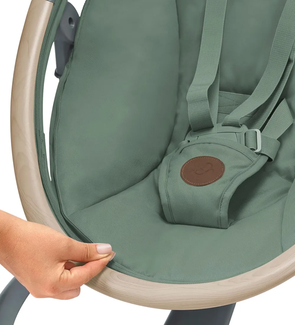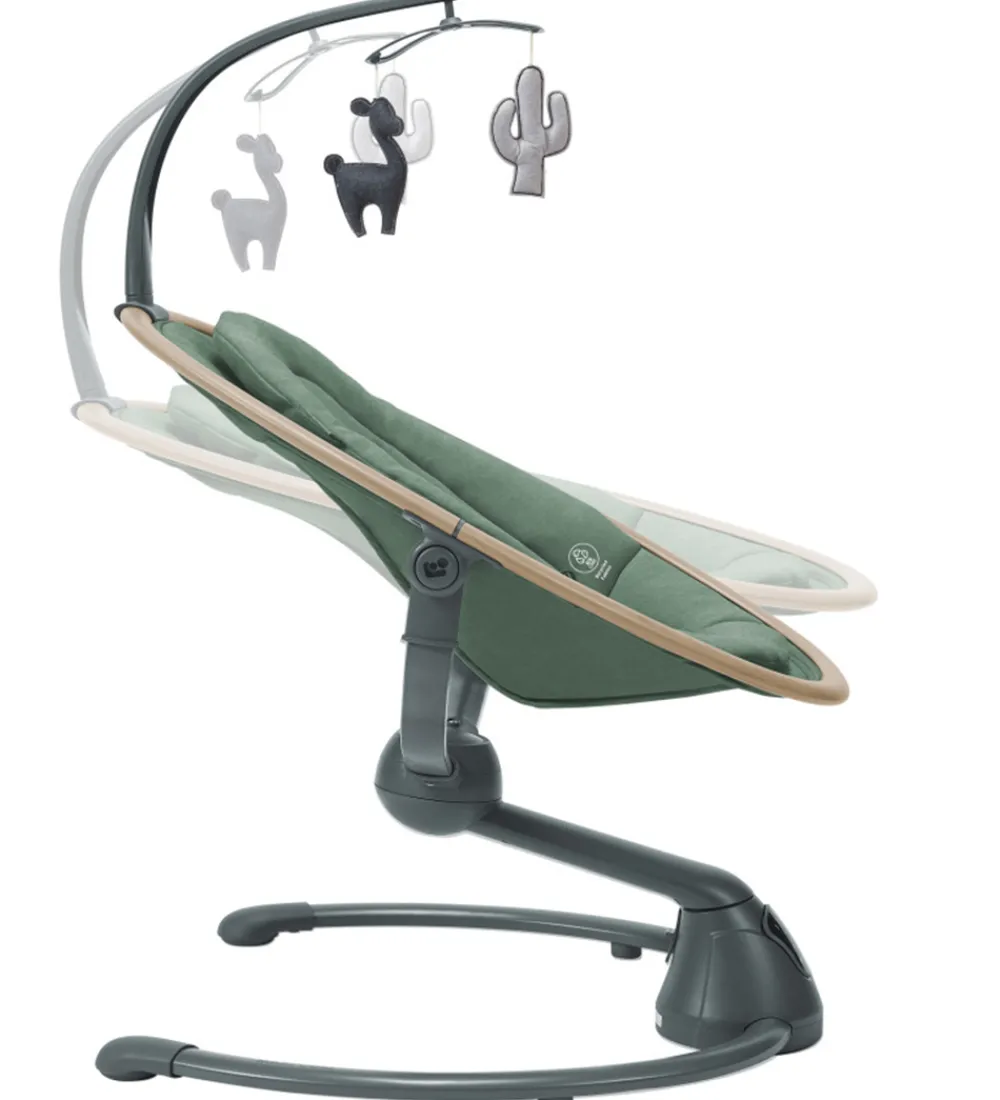Smart Maxi-Cosi skråstol i grønt tekstil og med et stel af lyst træ og grålakeret metal.
