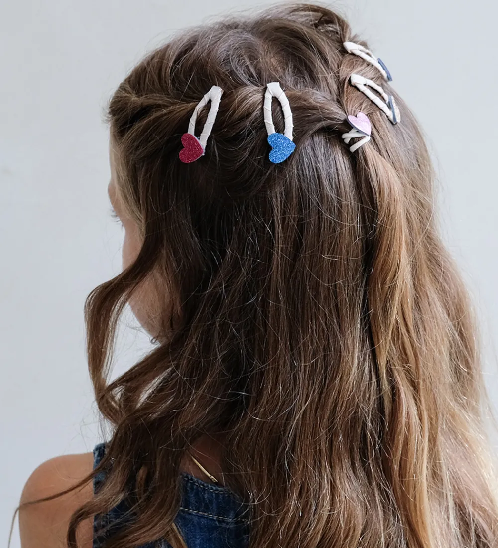 Seje Mimi & Lula hårspænder solgt i en 5-pak i lys glimmerbeige og med glimmerhjerter i forskellige farver.