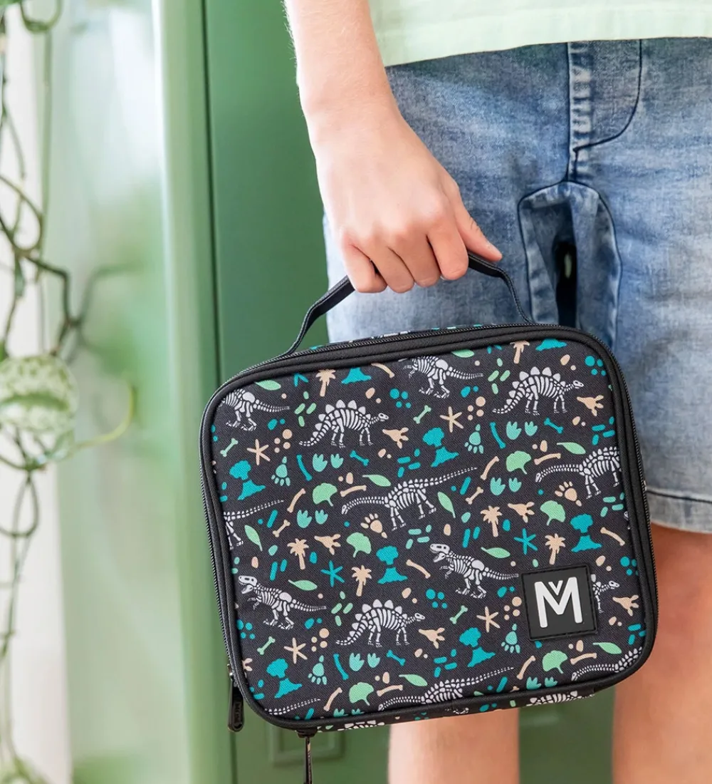 Lækker MontiiCo køletaske i sort med dinosaurprint i flotte farver.