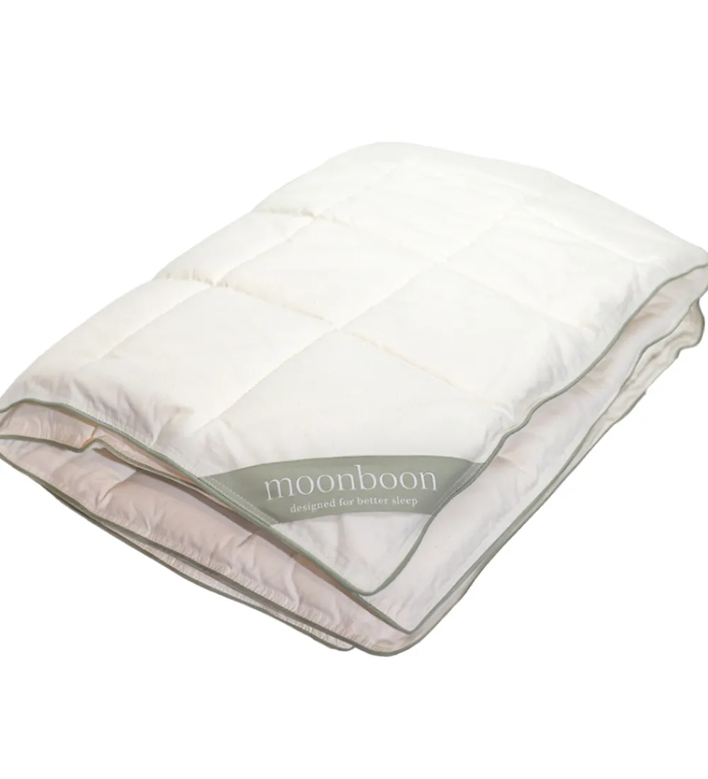 Moonboon dynen er i en babystørrelse. Dynen er blød, let og åndbar med en yderside af økologisk bomuld og et fyld af bambus- og polyfibre.