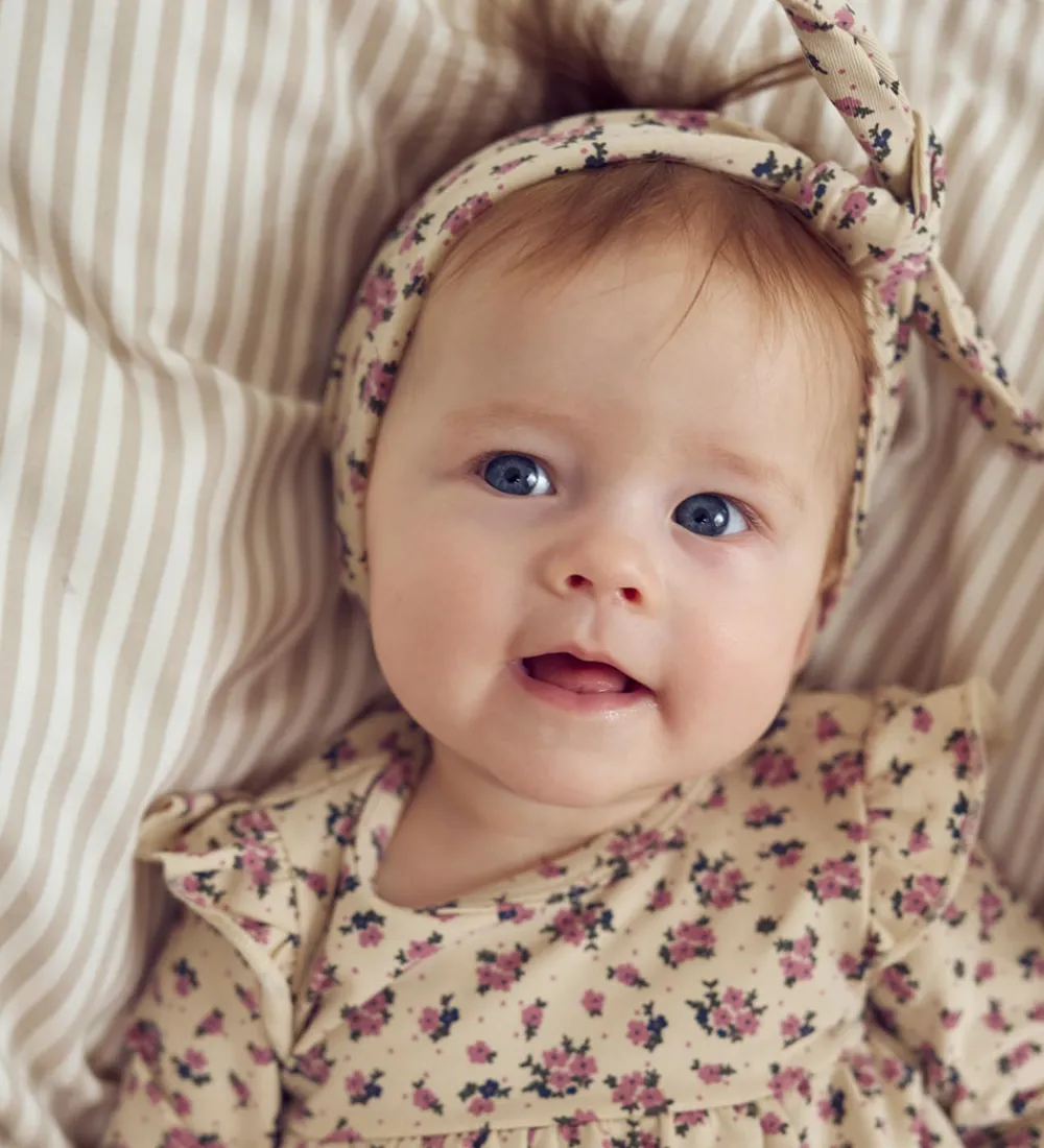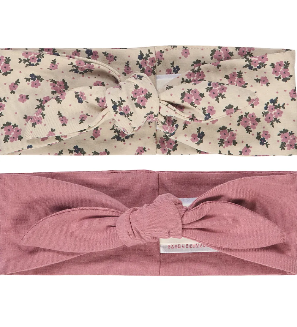 Müsli hårbåndene er brede og består at to lag blødt bomuldsjersey. Hårbåndene bindes i en knude, så de nemt kan tilpasses barnets hoved.