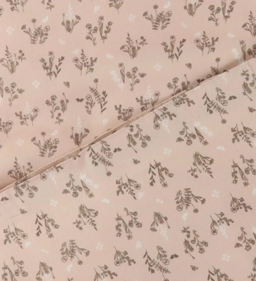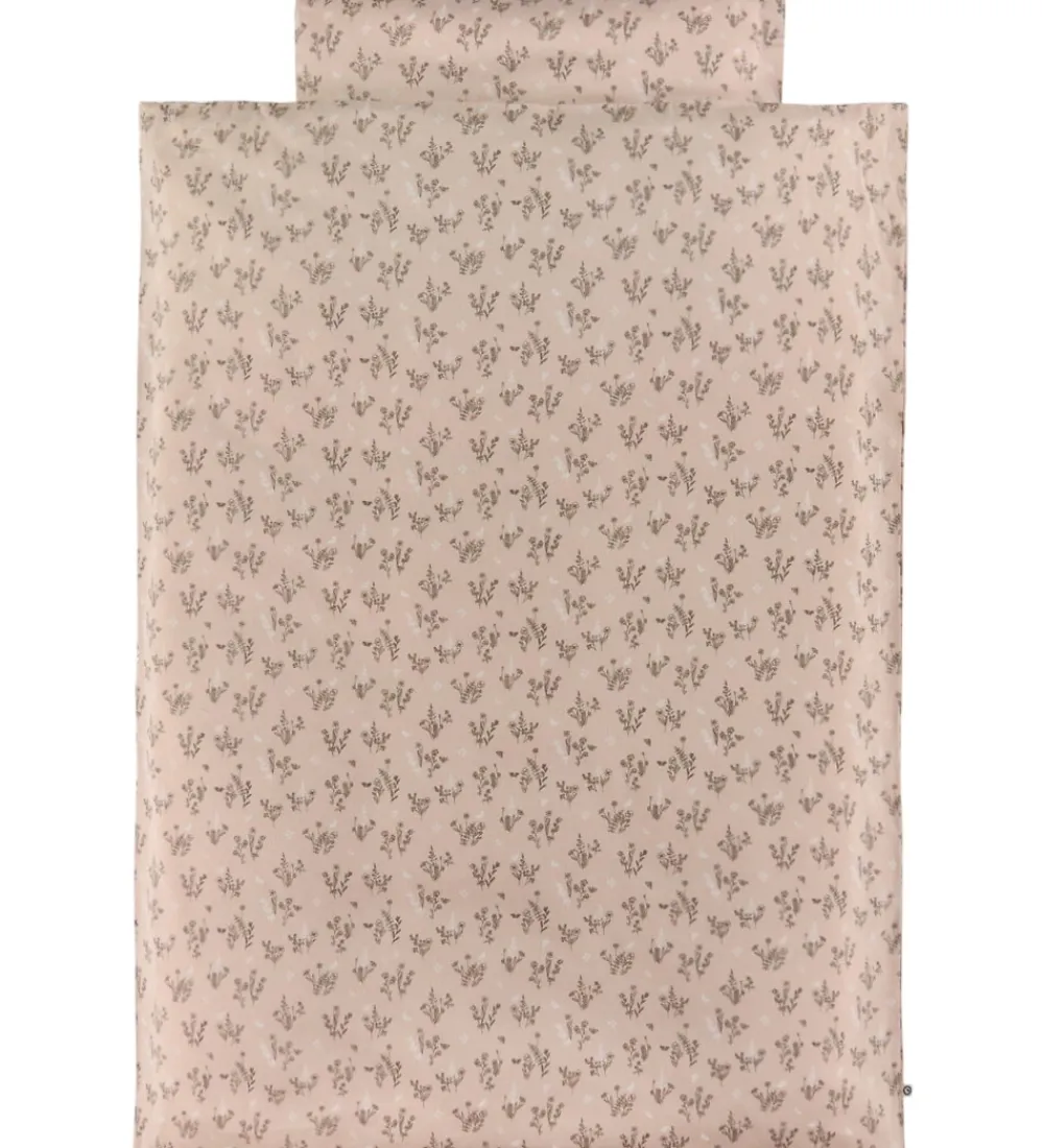 Fint Müsli sengetøj i rosa med blomsterprint i brun og hvid.