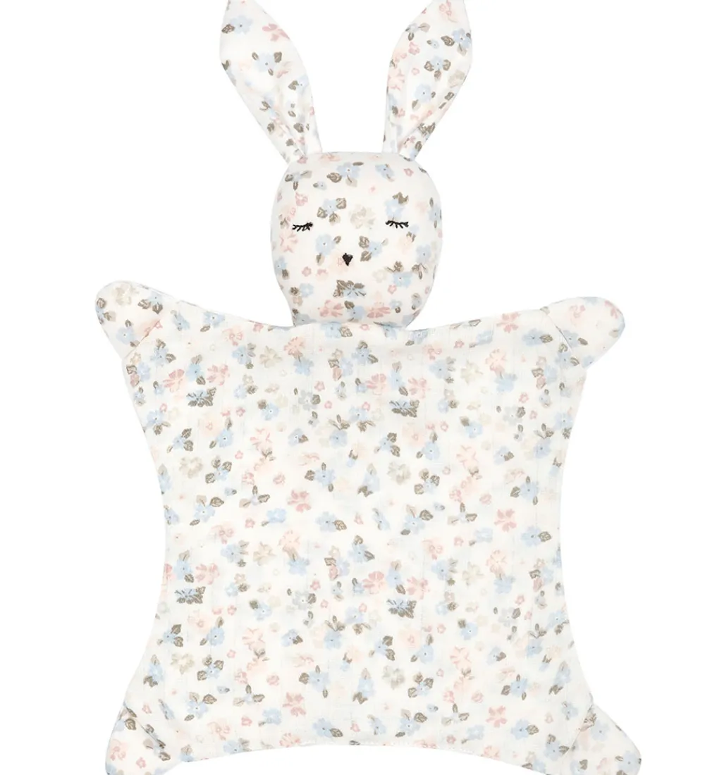 Sød sutteklud fra Müsli i hvid med et alloverblomsterprint i blå og rosa nuancer, og med et kattehoved i toppen.