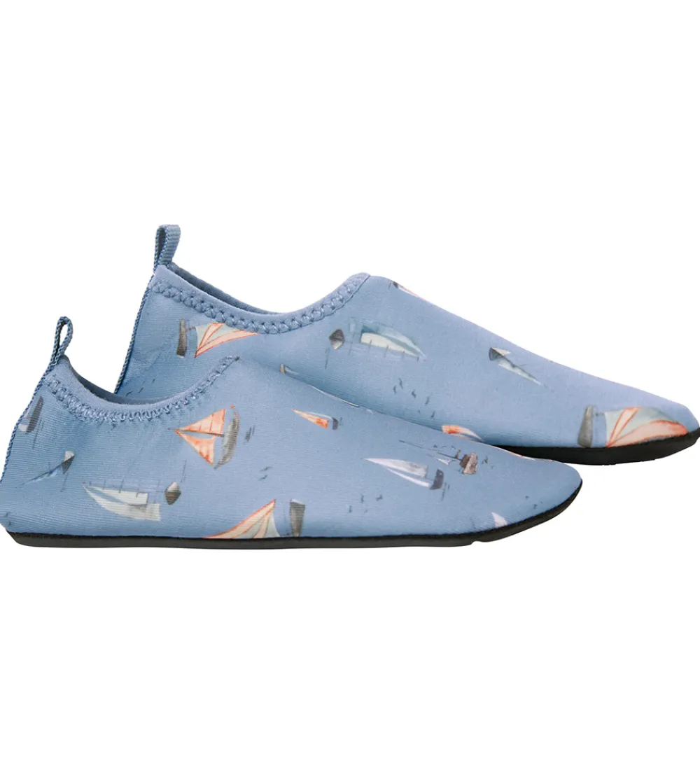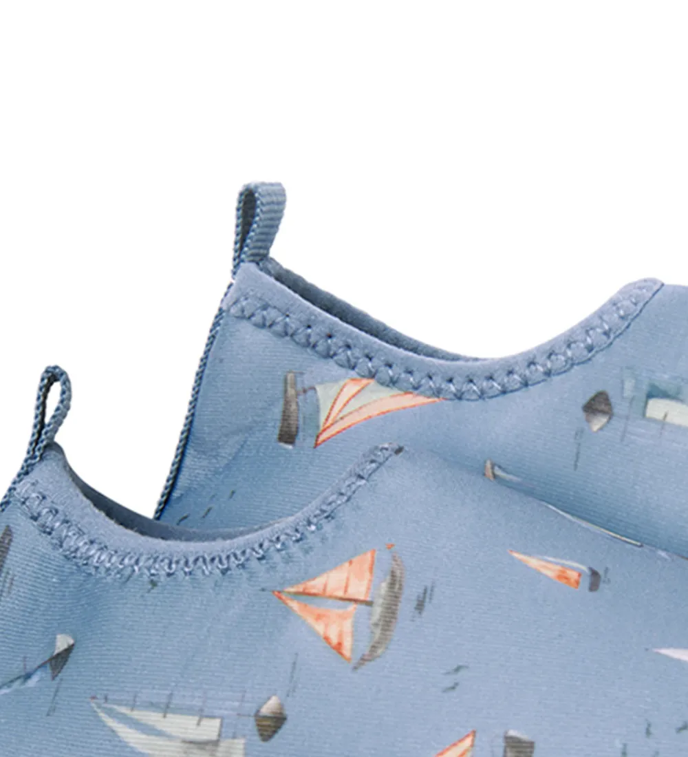 Name It badeskoene er lavet i et blødt og strækbart materiale med udtagelige indersåler. Bagtil er der en lille strop, som er behjælpelig når man skal have badeskoene på. Badeskoene har en god ydersål i sort med et praktisk mønster under bunden, som sikrer et godt fodfæste.