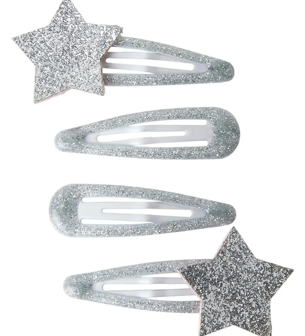 Flot Name It hårspænder solgt i en 4-pak i glitrende sølv med stjernedekorationer på to af spænderne. Name It hårspænderne tilføjer et festligt touch til enhver frisure.