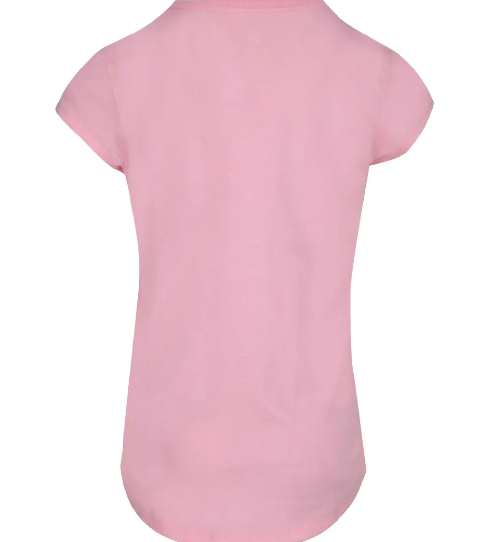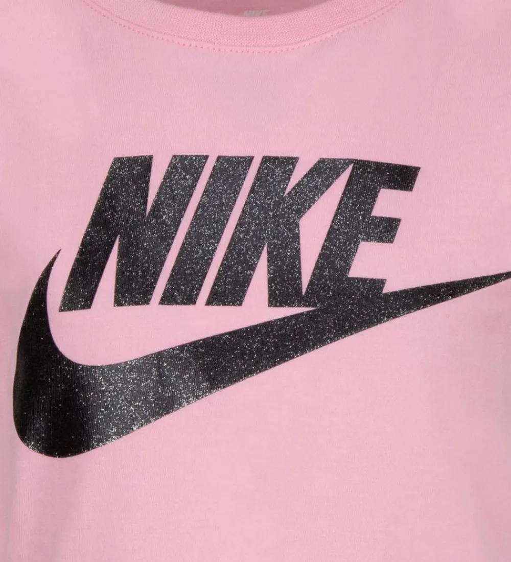 Fin Nike t-shirt i rosa med et stort logoprint på brystet sort med glimmer.