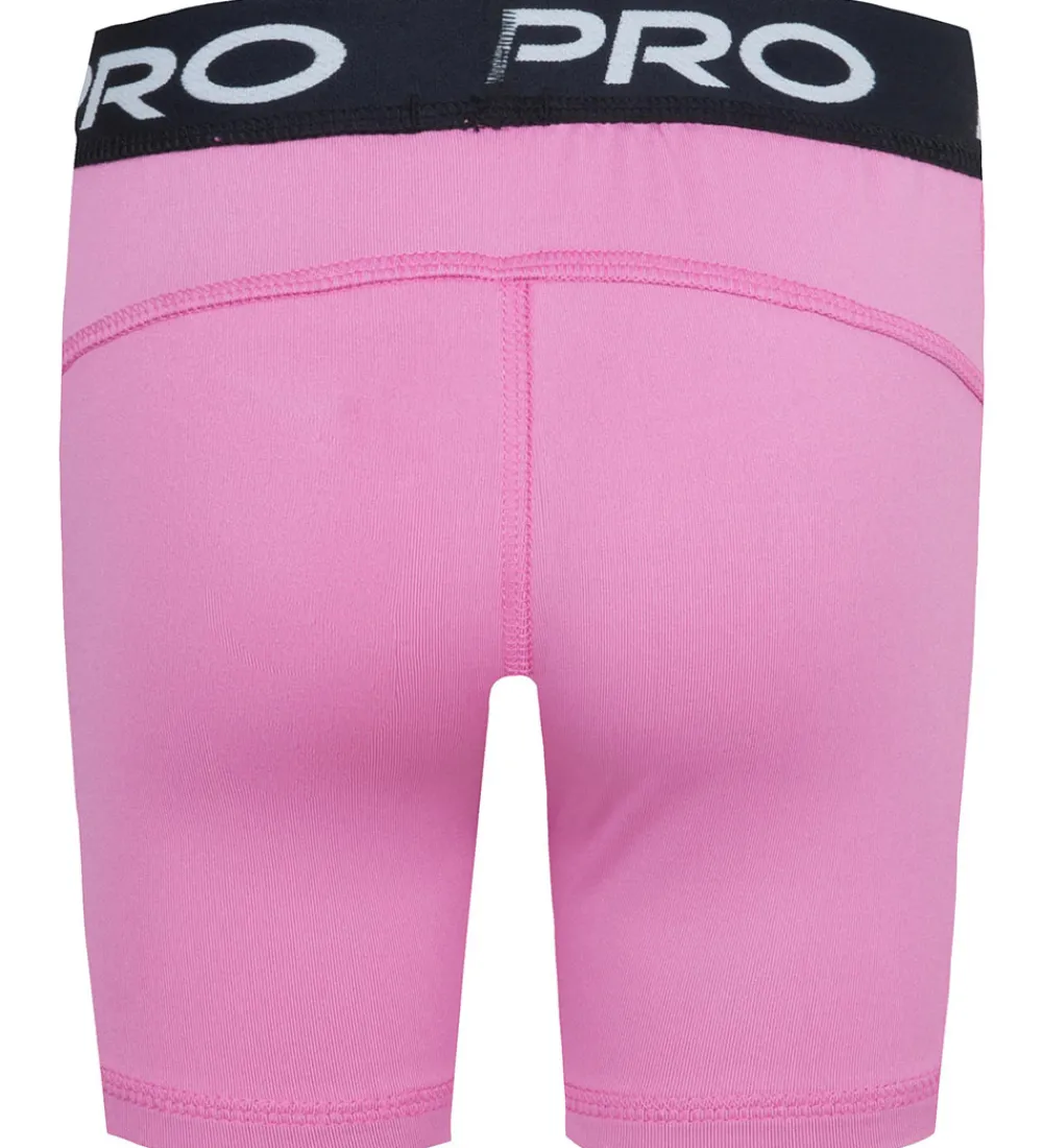 Smarte Nike cykelshorts i pink, og i livet er der en sort kant med teksten “Nike Pro” trykt i hvid.