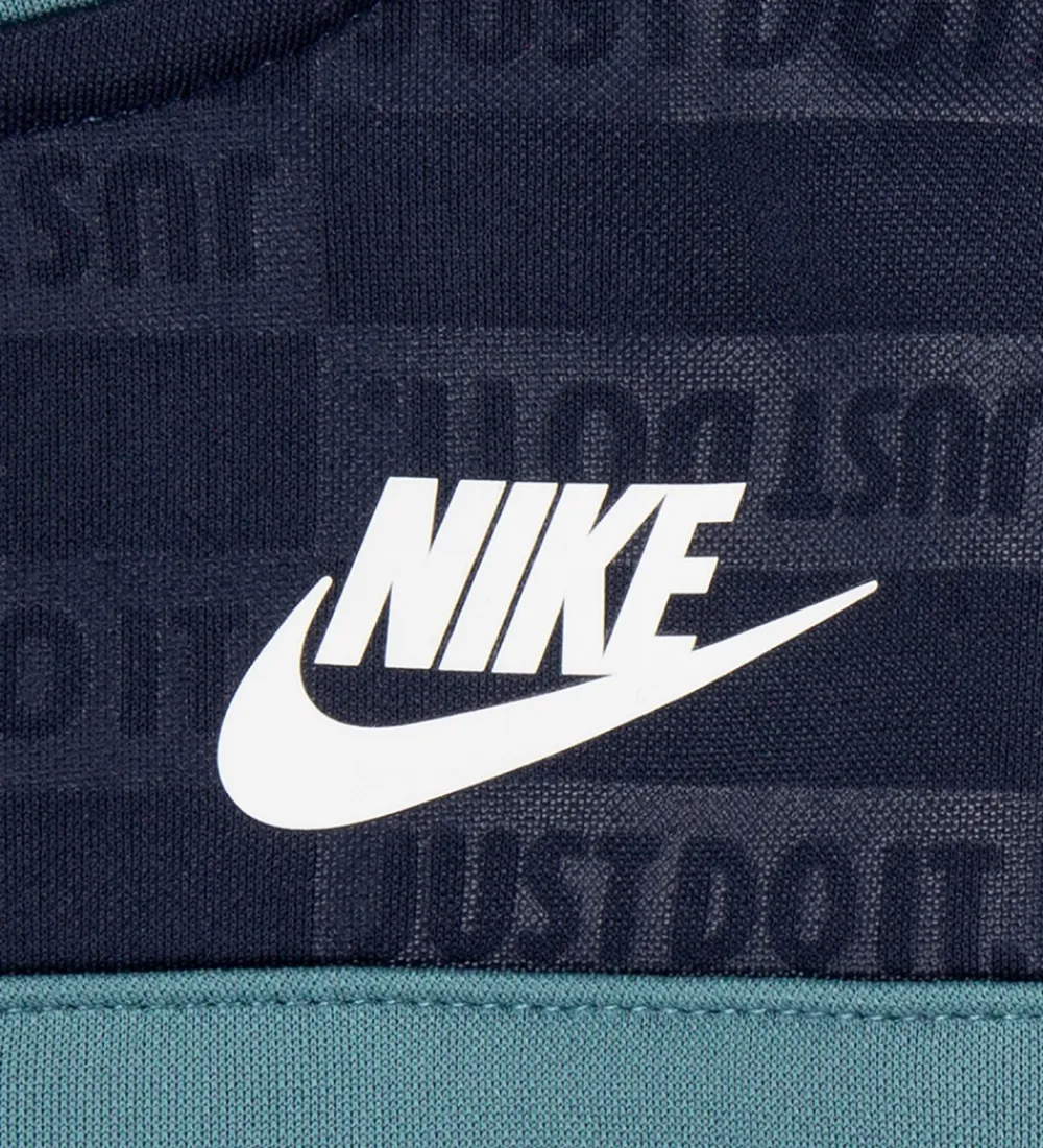 Stilfuldt Nike træningssæt der består af en cardigan og et par træningsbukser. Sættet er i navy med et distrik print med teksten “just do it.”, samt stribet detajler i støvet blå. Begge dele prydes af det velkendte Nike logo i hvidt.
