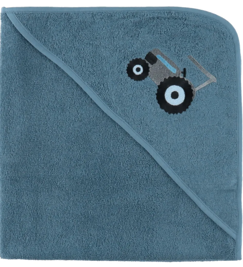 Lækkert Nørgaard Madsens babyhåndklæde i støvet blå med en broderet traktor, i brun og sort, på hætten.