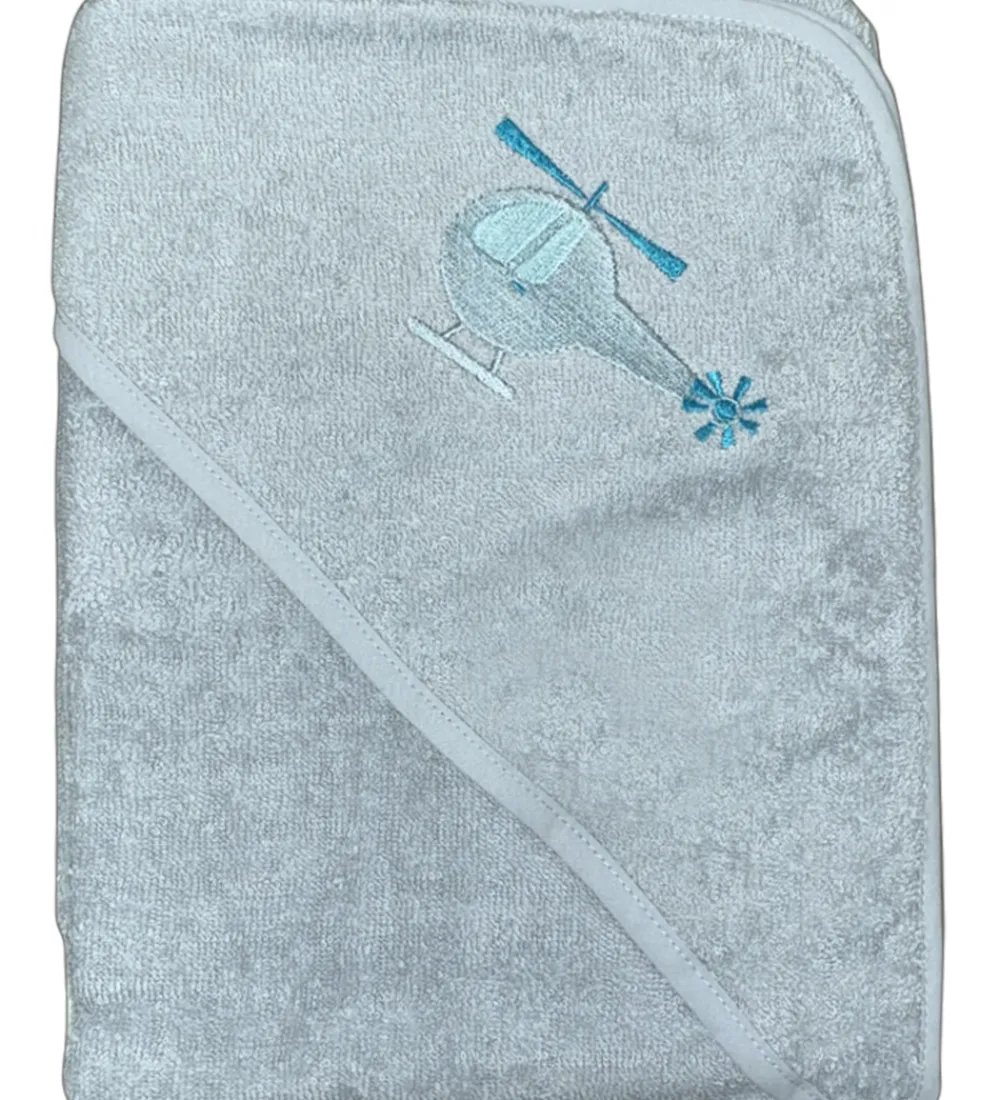 Fint Nørgaard Madsens babyhåndklæde i støvet grøn med en broderet helikopter på hætten.