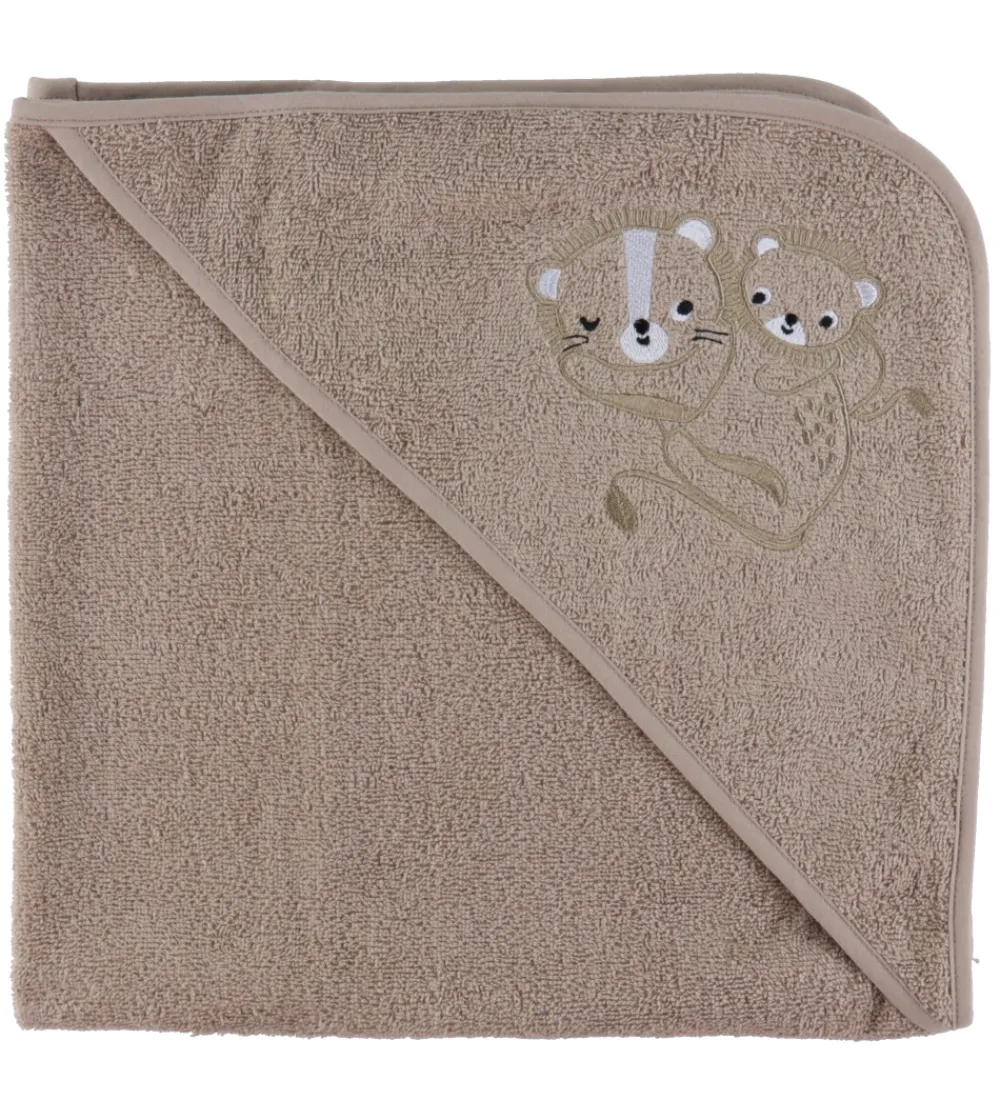 Skønt Nørgaard Madsens babyhåndklæde i en beige nuance med en brodering af to løver på hætten. Håndklædet giver en blød og hyggelig følelse til de små efter badet.
