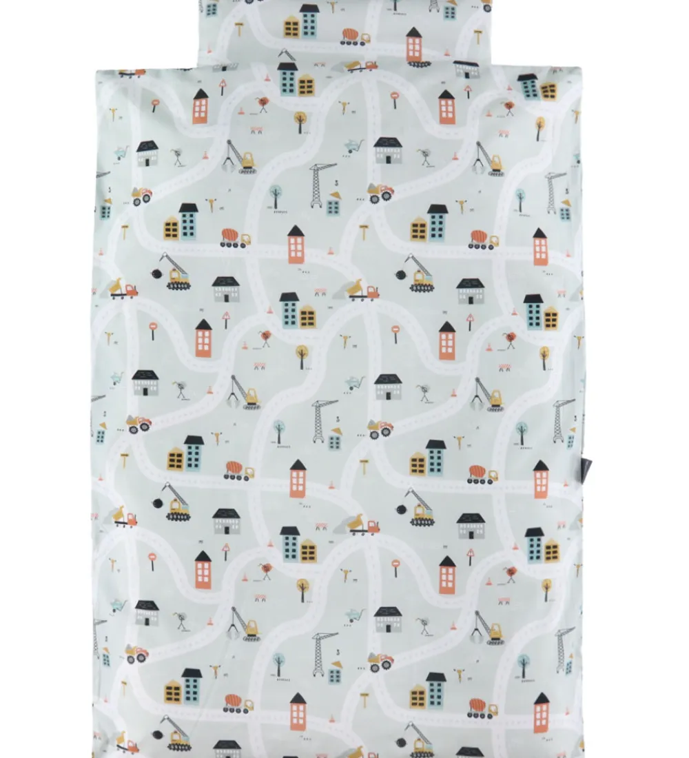 Smart Nørgaard Madsens sengetøj i lysegrå med et farverigt alloverprint af veje, huse og forskellige arbejdsmaskiner.
