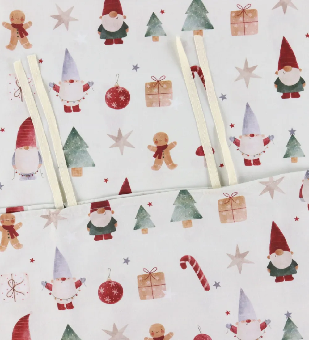 Lækkert Nørgaard Madsens sengetøj i hvid med et alloverprint med juletema i hvid, grøn, rød og brun.