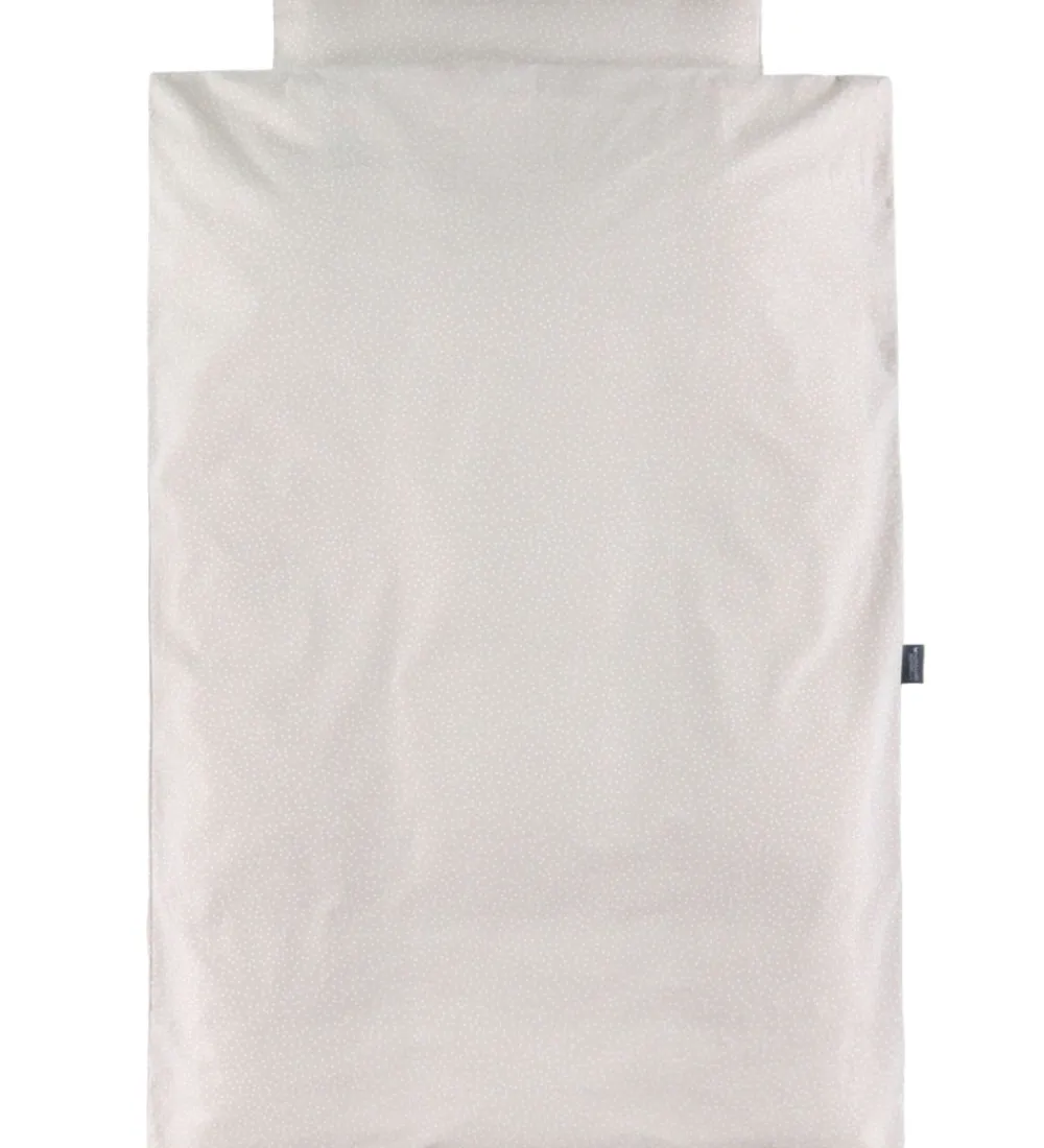 Flot Nørgaard Madsens sengetøj i mørkebeige med hvide prikker.