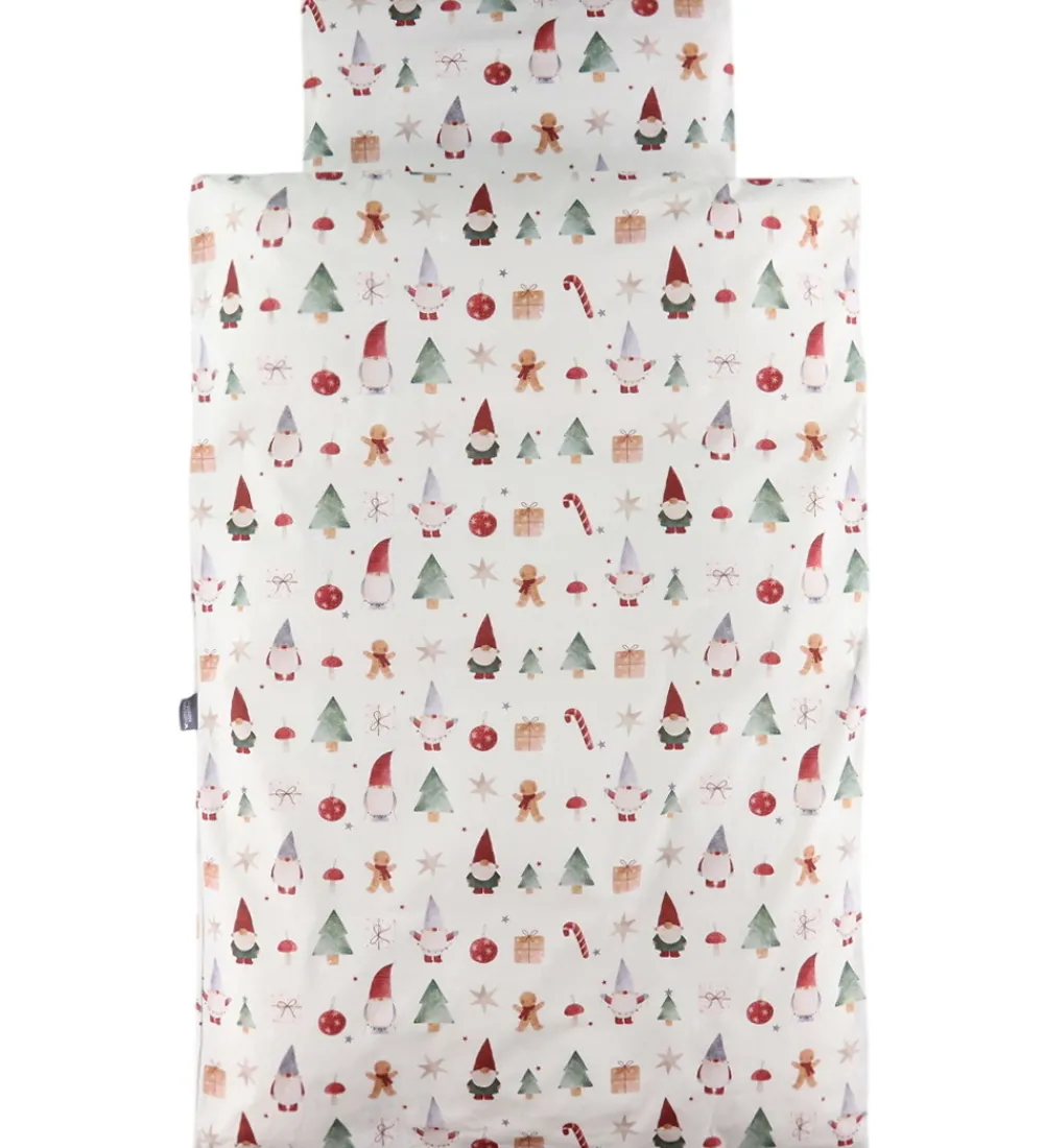Fint Nørgaard Madsens sengetøj i hvid med et alloverprint med juletema i hvid, grøn, rød og brun.