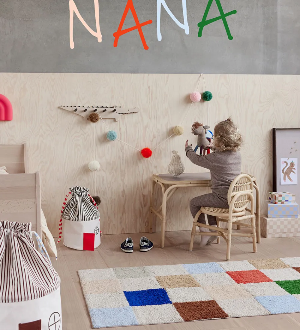 Farverigt OYOY tæppe, designet med et charmerende firkantet mønster. Tæppet præsenterer en variation af bløde farver, der skaber en hyggelig atmosfære i ethvert rum.