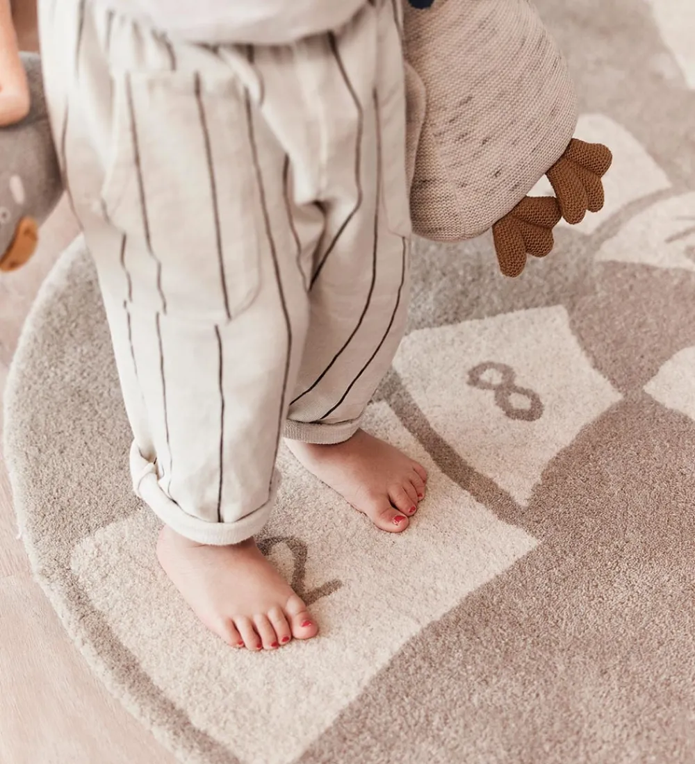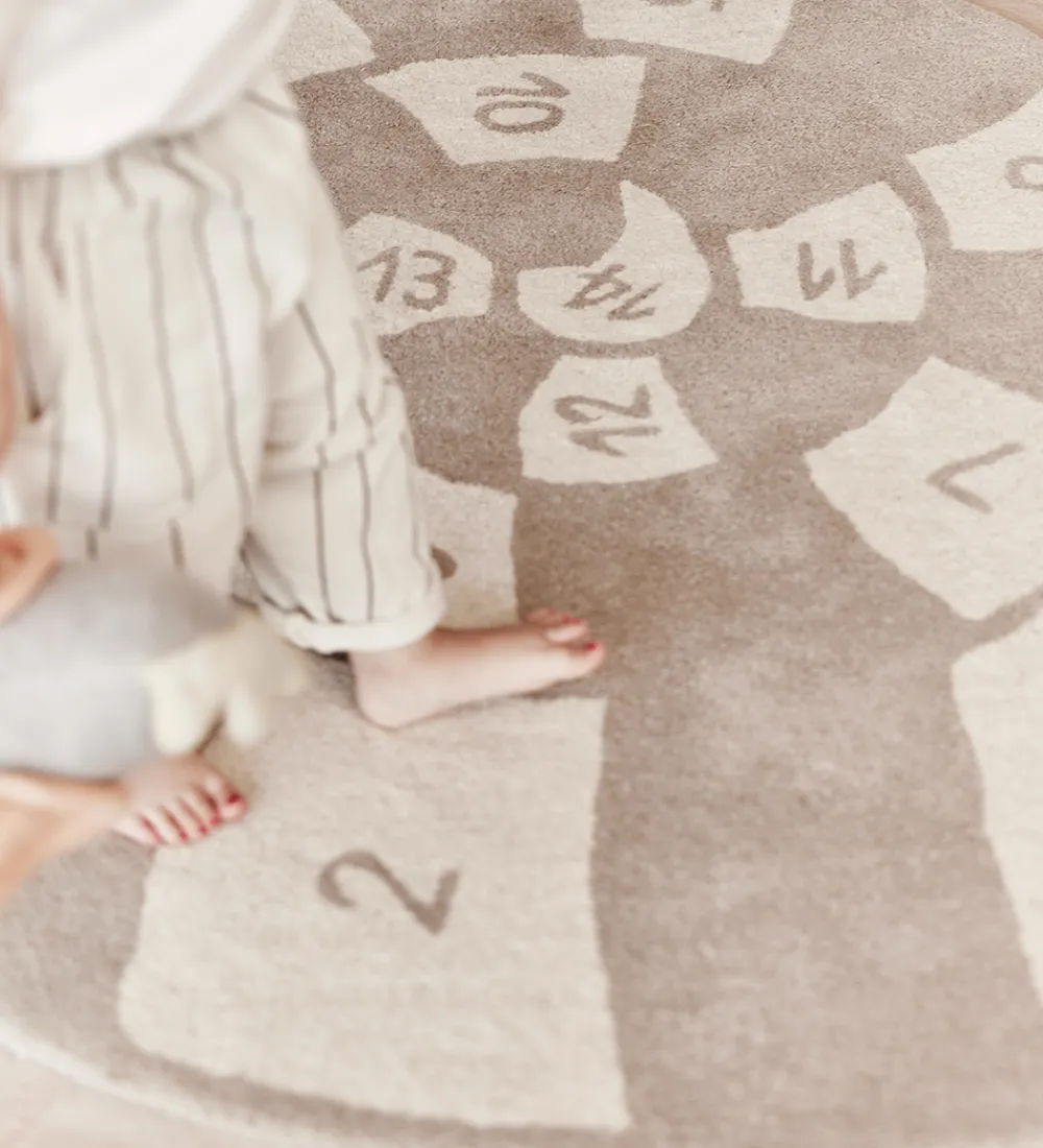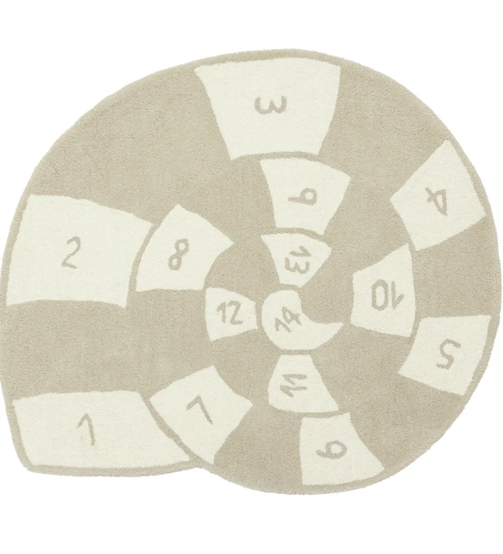 Skønt OYOY hinketæppe i beige og cremehvid med form som et sneglehus og inddelt i felter med tal i.